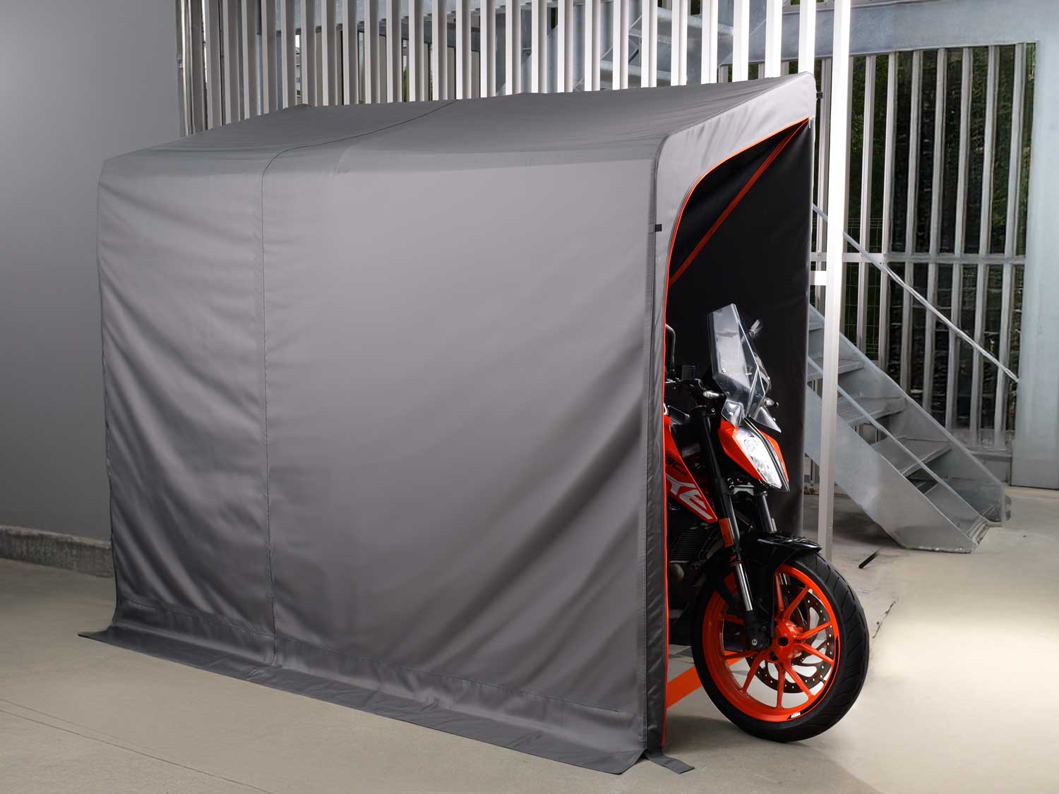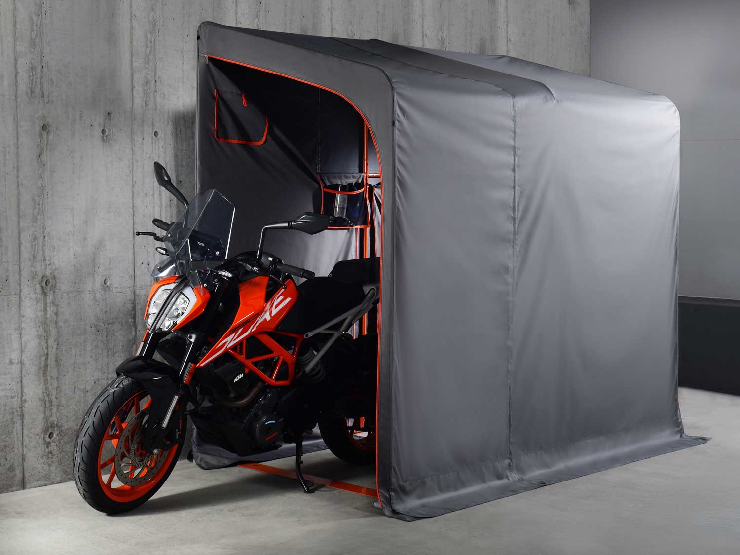 「BIKE GARAGE 2250 KABE」的內部設計也考慮到了通風問題,配備了上下通風口,能有效排出庫內的熱氣和濕氣。這款車庫的開口設計可以利用魔鬼氈調整開口的大小,甚至可以完全打開,方便車主進出和操作。室內特別附帶一個多功能收納袋,可以靈活地安裝在車庫內的任意位置,用來存放抹布、工具或清潔用品等。此外,外罩的材質也相當耐用,符合美國防火標準 CPAI-84,能有效降低火災風險,讓車主更加放心。