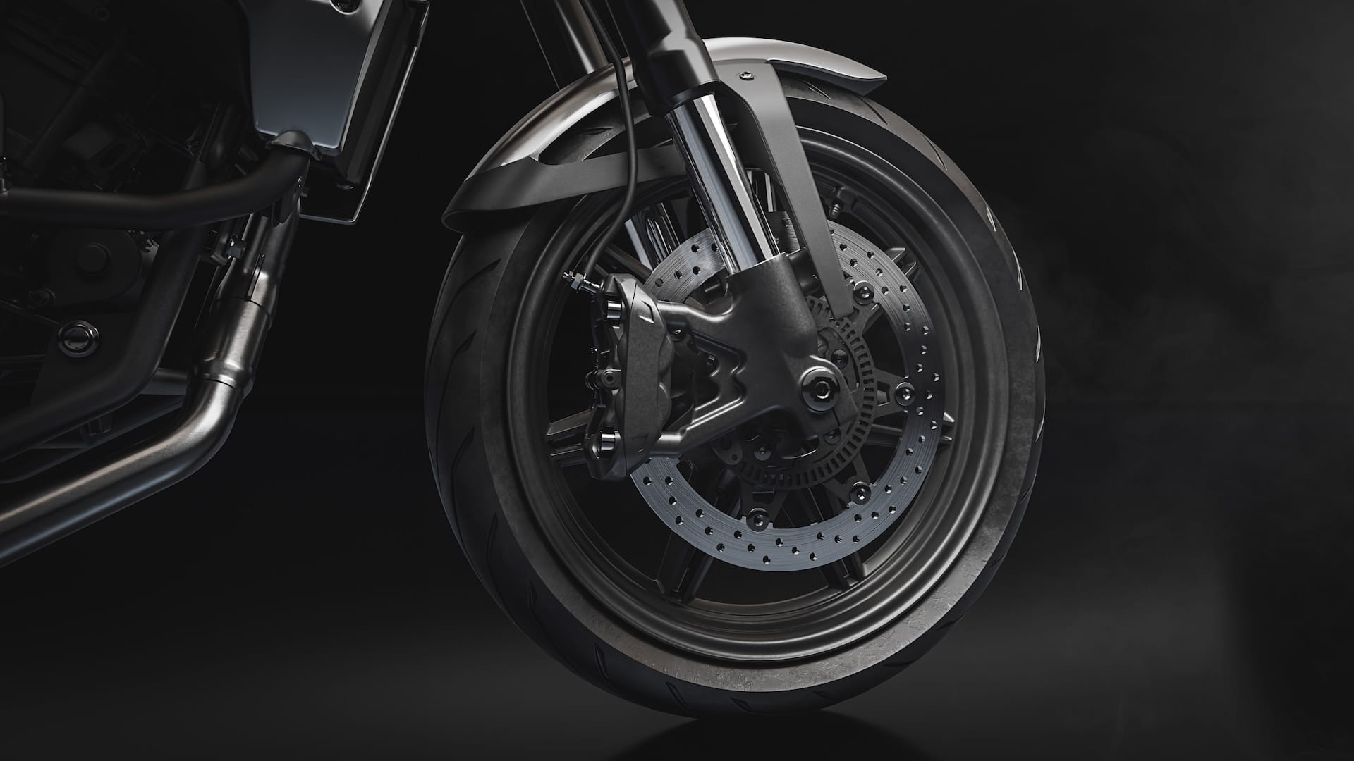 刹車方面,前輪配備 300mm 單碟,並使用固定式四活塞卡鉗;後輪則搭載 255mm 單碟,並配有雙活塞卡鉗。車輛還標配雙通道 ABS 系統,增強安全性。輪胎方面,前輪為 110/70-17,後輪則為 150/60-17,提供穩定的抓地力。