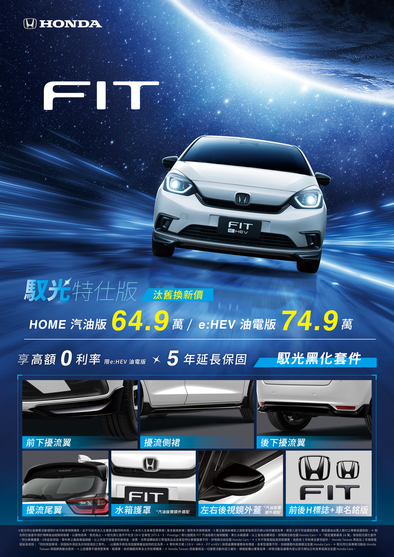 即日起~11/30止入主FIT HOME汽油版及節能省油王FIT e:HEV油電版免費升級「馭光特仕版」黑化套件組,包含「前下擾流翼、擾流側裙、後下擾流翼、擾流尾翼、水箱護罩、左右後視鏡外蓋、前後H標誌+車名銘版(其中水箱護罩、左右後視鏡外蓋HOME版需額外選配)」、「高額0利率(HOME版除外)」、「5年延長保固」,HOME版再享汰舊換新價64.9萬元、e:HEV版74.9萬元的限時優惠,讓預算型買家購車零負擔。