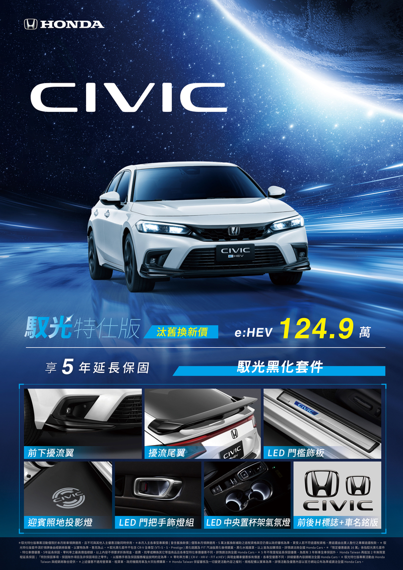 即日起~11/30止入主CIVIC e:HEV次世代電油車享「馭光特仕版」黑化套件組,包含「前下擾流翼、擾流尾翼、LED門檻飾板、迎賓照地投影燈、LED門把手飾燈組、LED中央置杯架氣氛燈、前後H標誌+車名銘版」,再享「5年延長保固」與汰舊換新價124.9萬元,總價值高達16萬元的限時豪禮,成就買家獨具魅力的零里程焦慮駕乘體驗。