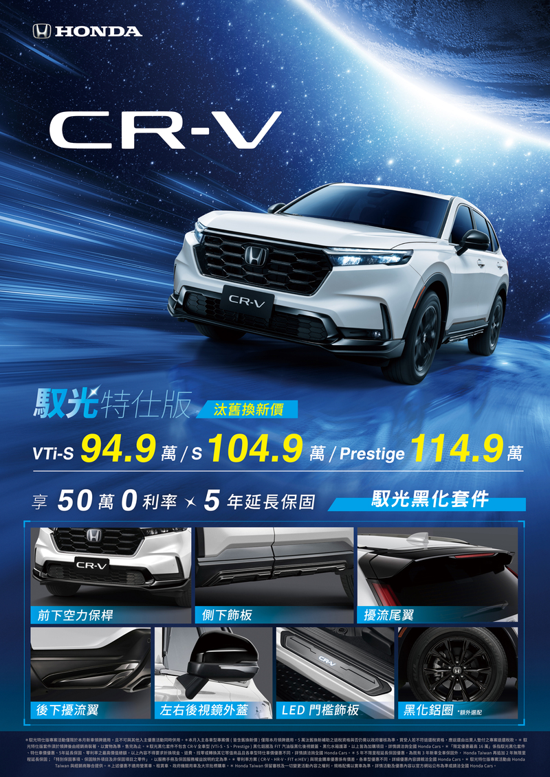 即日起~11/30止入主CR-V全車型限量免費升級「馭光特仕版」黑化套件組,包含「前下空力保桿、側下飾板、擾流尾翼、後下擾流翼、左右後視鏡外蓋、LED門檻飾板」,另享有「50萬0利率」、「5年延長保固」優惠豪禮,CR-V VTi-S再享汰舊換新價94.9萬元、S 104.9萬元、Prestige 114.9萬元優惠,其中S和Prestige車型更擁有總價值高達16萬元的限時豪華贈禮,讓消費者輕鬆擁有獨特的黑潮風格與強悍的動力性能,實現滿載全家人的移動夢想喜悅。