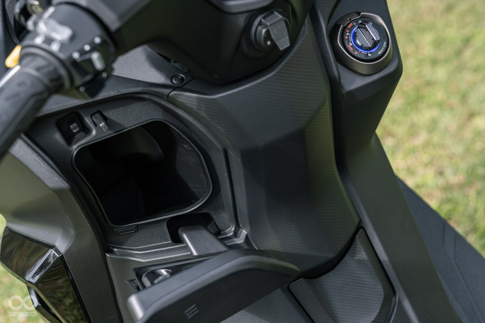 置物空間表現,DOWNTOWN GT350 的車廂能輕鬆放入兩頂全罩式安全帽,還有餘裕能收納皮夾、雨衣等小物,龍頭左右更有兩組手套箱,實測可以塞進一瓶礦泉水,握把中央部分則隱藏有 USB-C 的充電孔,並貼心設計走線的孔洞,搭配手機架使用更便利。