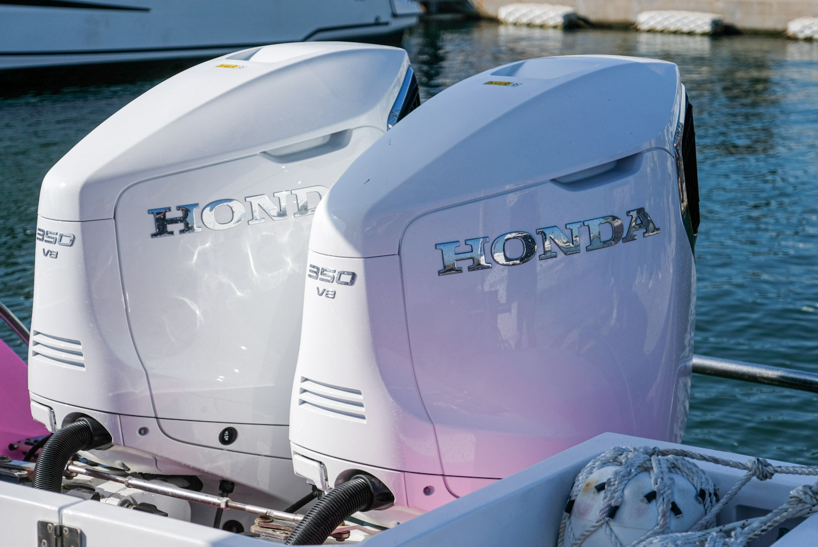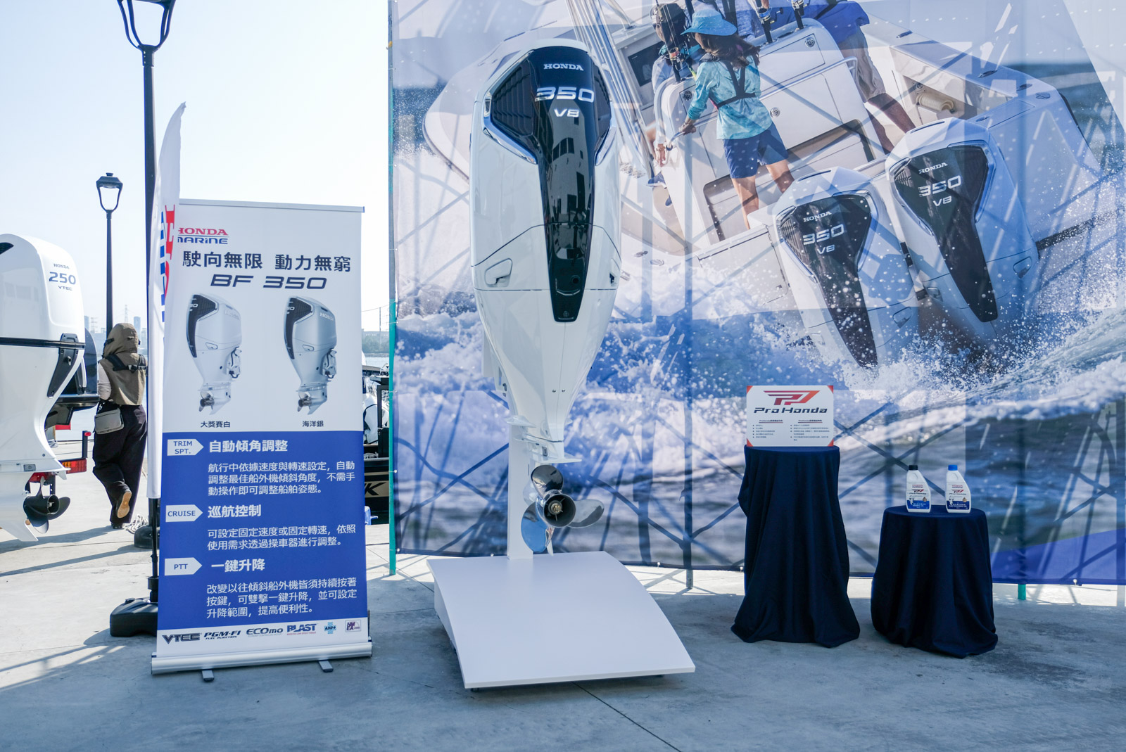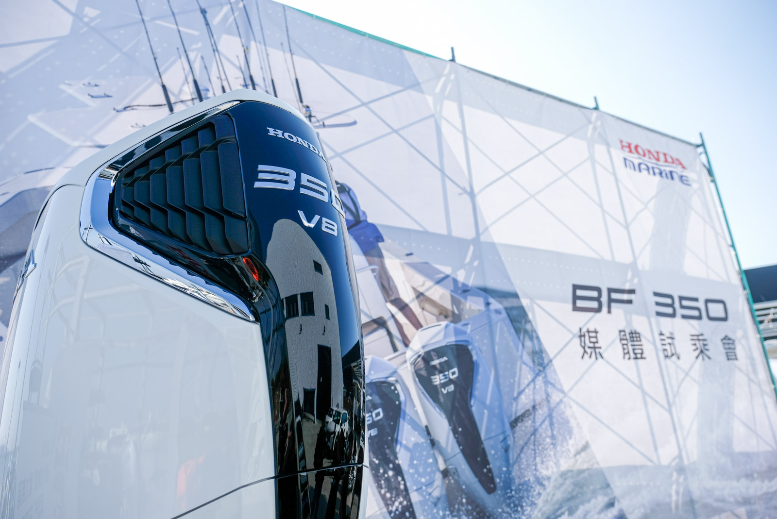 Honda BF350 是一款針對娛樂與工作需求設計的四行程船外機,搭載強勁的 60° V8 引擎,排氣量達 4,952cc,能輸出高達 350 匹馬力。。Honda 更採用來自汽車領域的多項技術,例如耳熟能詳 VTEC 可變氣門技術與 PGM-FI 燃料噴射系統,不僅提升了加速性能,更實現了高效省油與低排放。