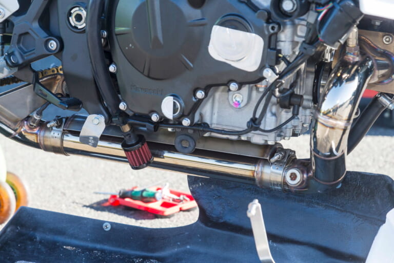 TRICKSTAR 的技師中村公治緊急調整了排氣管與洩壓系統,將壓力更均勻地釋放出去,同時更換了大一點的 44T 後齒盤,以便更好地檢測引擎的負載。