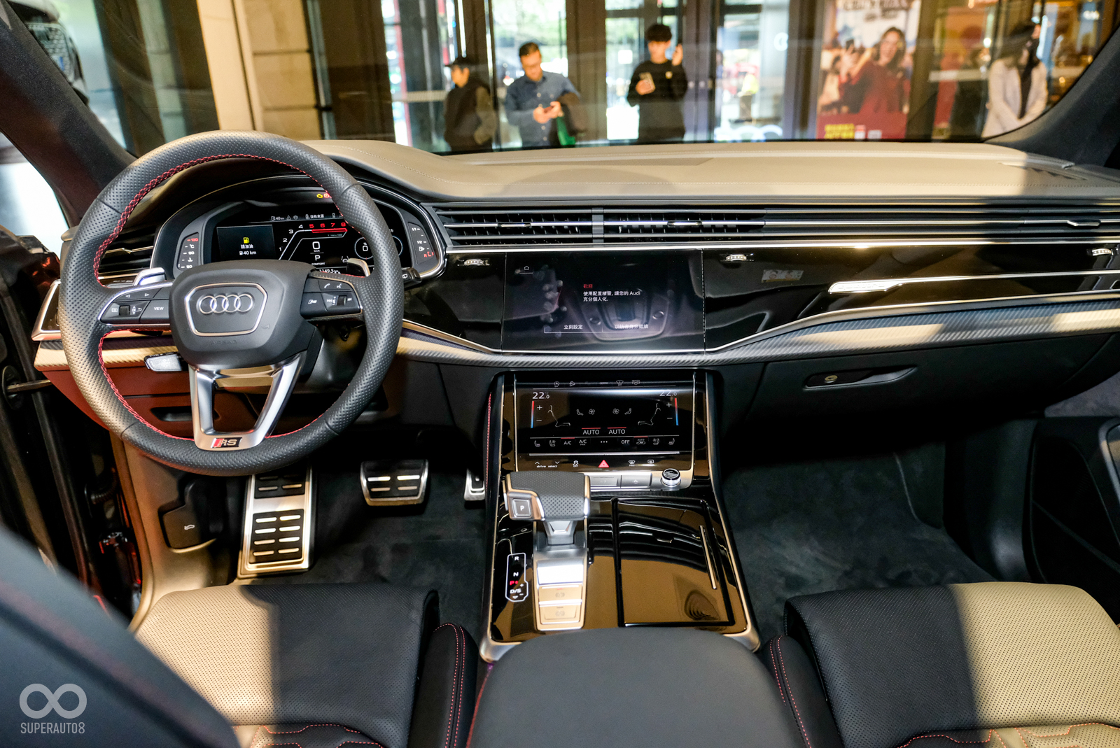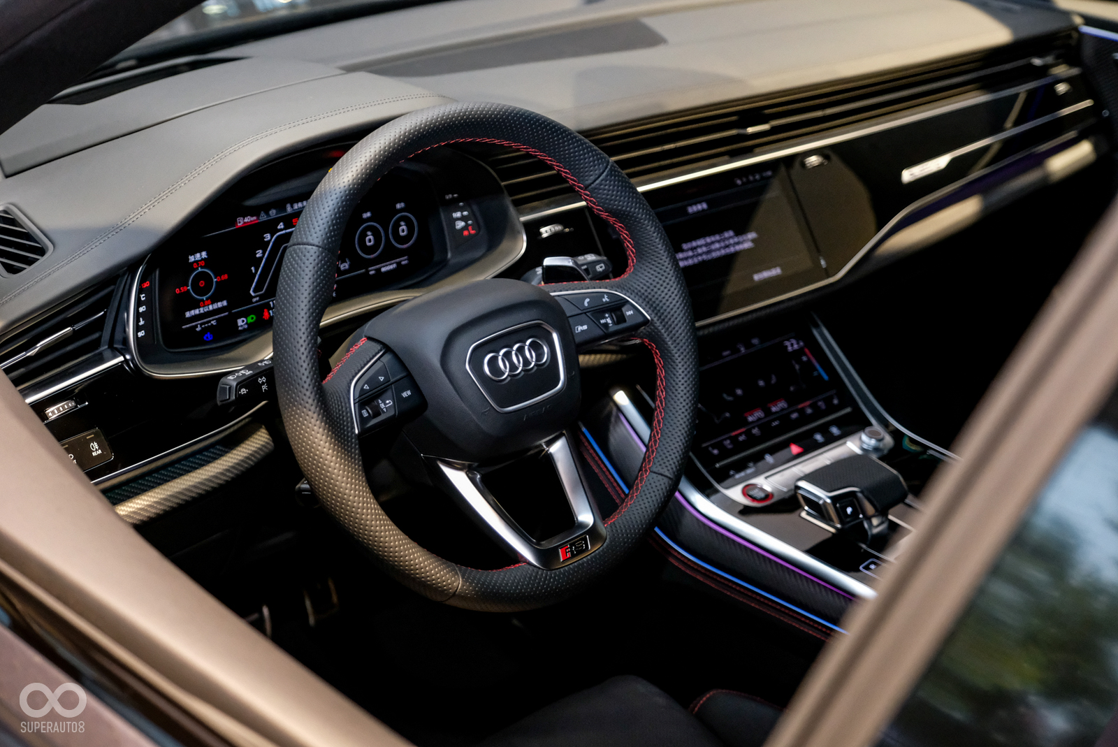 RS 制霸氣勢: 全新Audi RS Q8以全新CI 與家族設計語彙而生,為讓車主享受頂級性能時尚魅力,台灣奧迪於新年式車款將黑色風格外觀套件列為標準配備,從黑色水箱護罩、後視鏡罩及窗框,搭配全新設計Audi Sport 23吋雙色鋁圈形塑黑化視覺張力,同時車艙更滿載RS 專屬熱血元素,打造質感跑格座艙,由裡到外散發Audi Sport制霸氣勢。