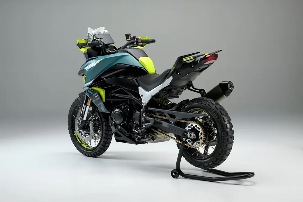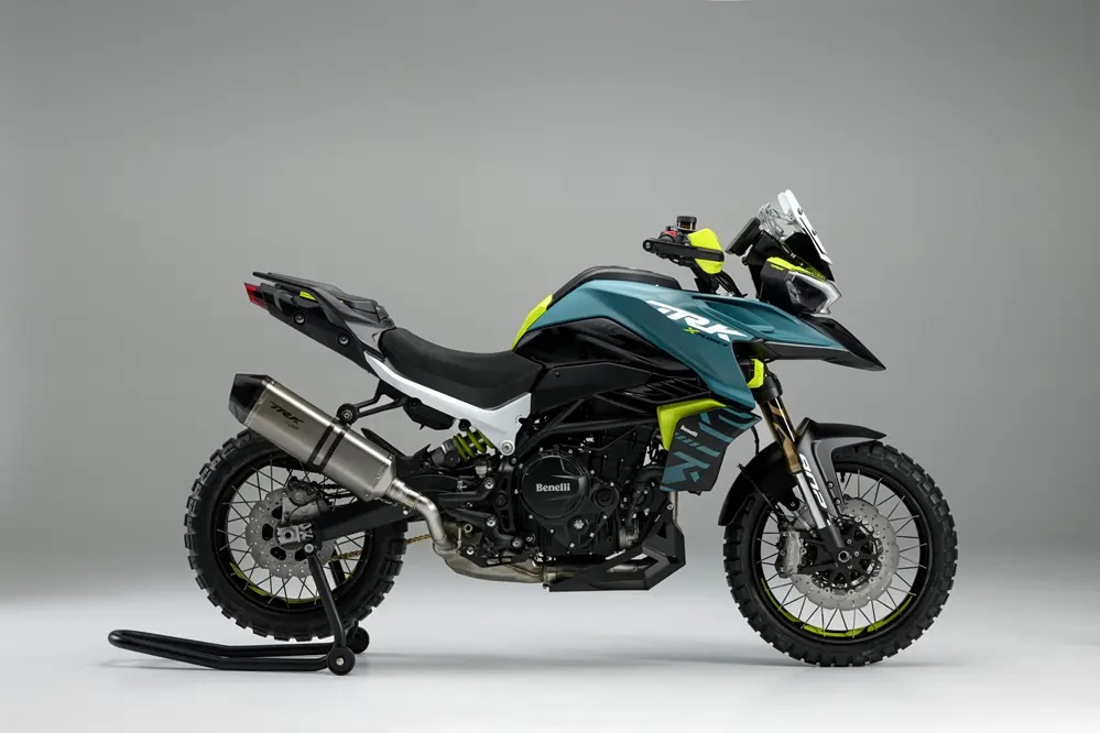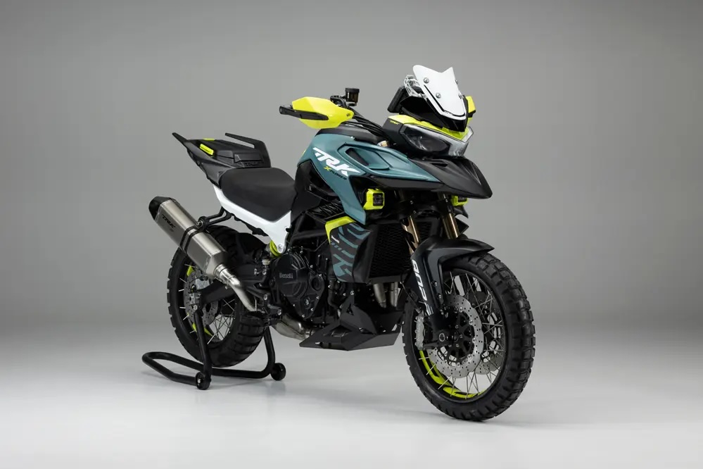 Benelli TRK 902 Xplorer 的設計極具冒險風格,車身採用了亮眼的藍綠與螢光黃配色,並搭配流線型車殼與強化防護的底部護板,突顯其越野性能。此外,其單座椅設計在原型車中取消了後座,並改為工具箱配置,進一步彰顯其專注於單人騎乘的冒險定位。
