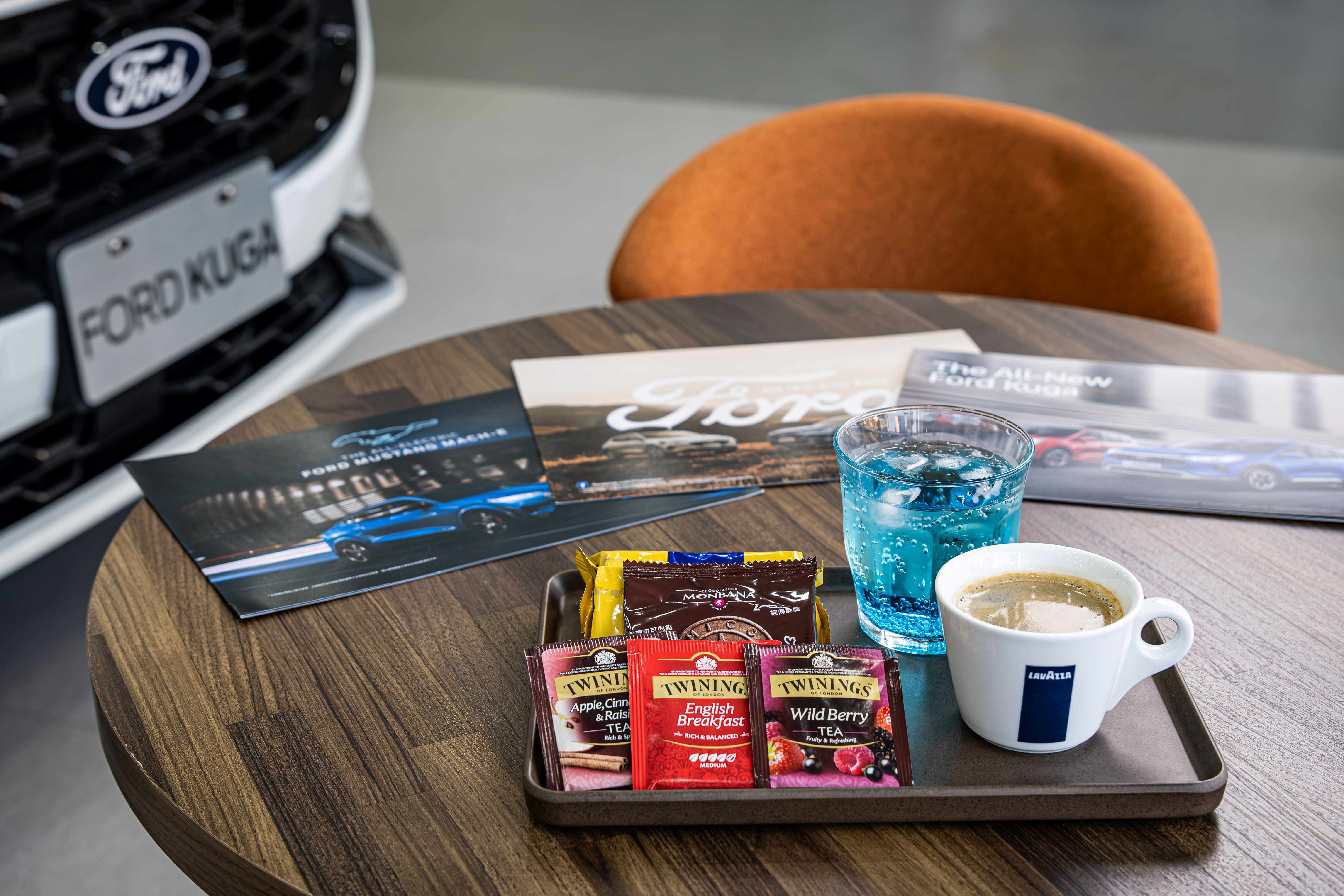 Ford高雄九和一心展示中心提供義大利百年經典品牌LAVAZZA咖啡、BEVCO氣泡水,以及專用調飲糖漿,同時搭配Costco好市多當季檔期精選的甜、鹹點心,讓消費者在賞車洽談時,也能享受義式與美式交融的愜意時光。此外,提供Wi-Fi、插座和USB充電裝置等貼心設計,讓手機、平板電腦、筆電隨時都可充電,以自在溫馨的氛圍,打造舒適放鬆的交流空間,讓顧客在賞車之餘也能自在上網或處理公事。