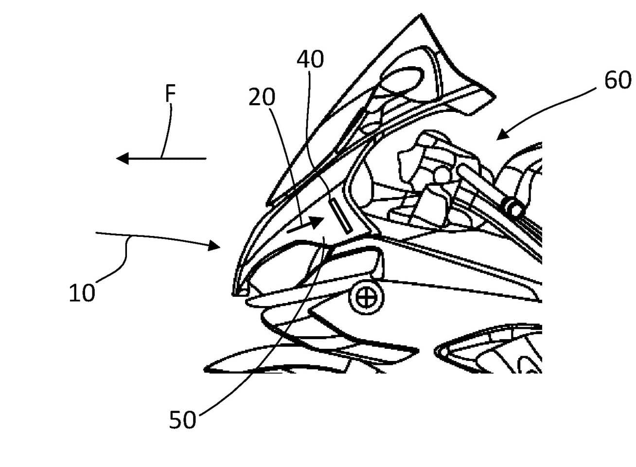 專利顯示,這項技術的關鍵在於巧妙地引導高壓氣流。具體而言,他們利用摩托車車頭進氣口收集空氣,然後通過車體內部的管道將其導出,並在車把前方的狹窄縫隙中釋放出來。這些氣流以接近 90 度的角度離開車體,模仿了 Gurney Flap 的效果,但不需要任何可見的外部結構。