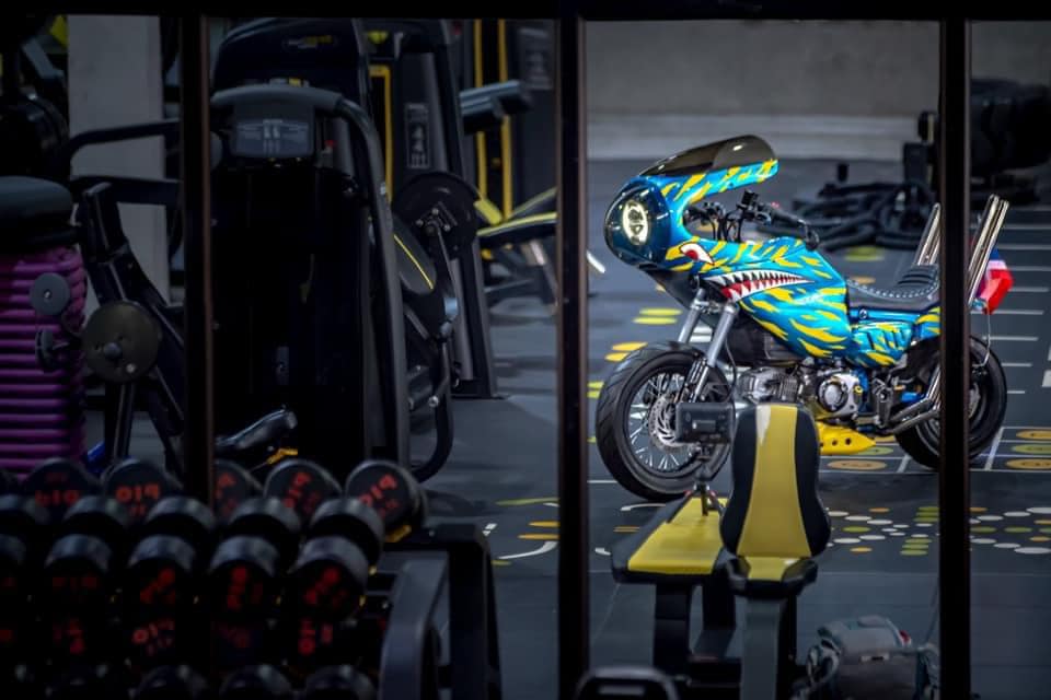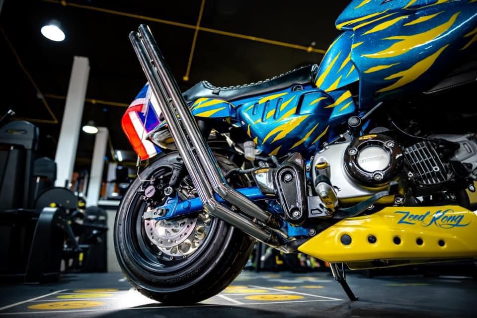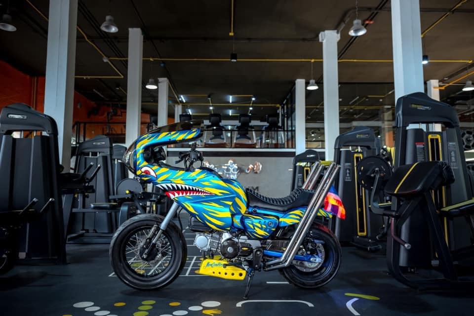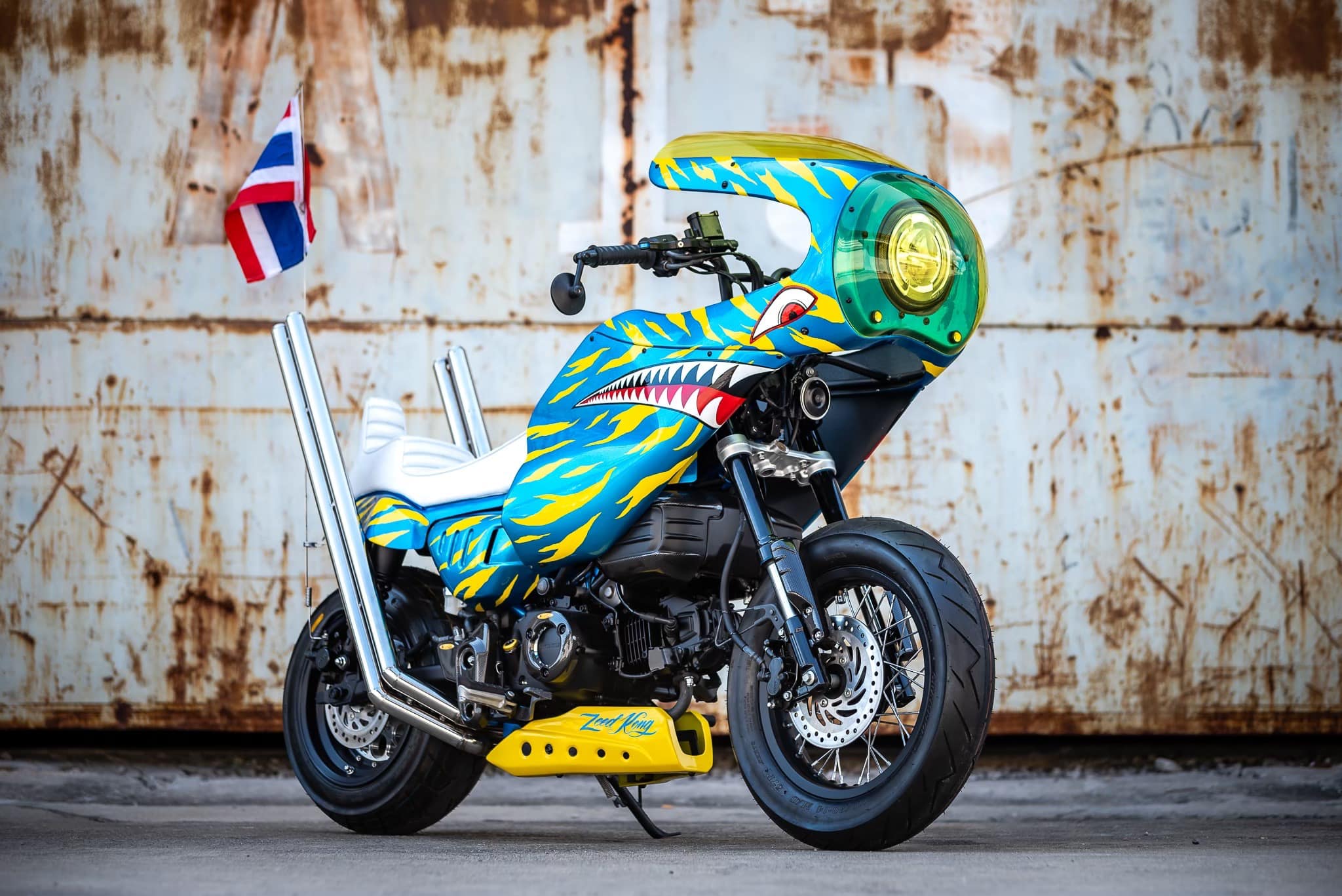 這台車的設計可謂極盡誇張,雙出排氣管發出震撼街頭的聲浪,彷彿是一場機車交響樂;座椅採用不協調的白色,像是在挑釁傳統審美觀;鮮黃色的風鏡與綠色大燈護罩,更是無視所有色彩搭配的規則,讓人一眼便無法忽視。此外,車體上的鯊魚牙齒塗裝更像是在大聲宣告:這絕不是一台平凡的Monkey 125。