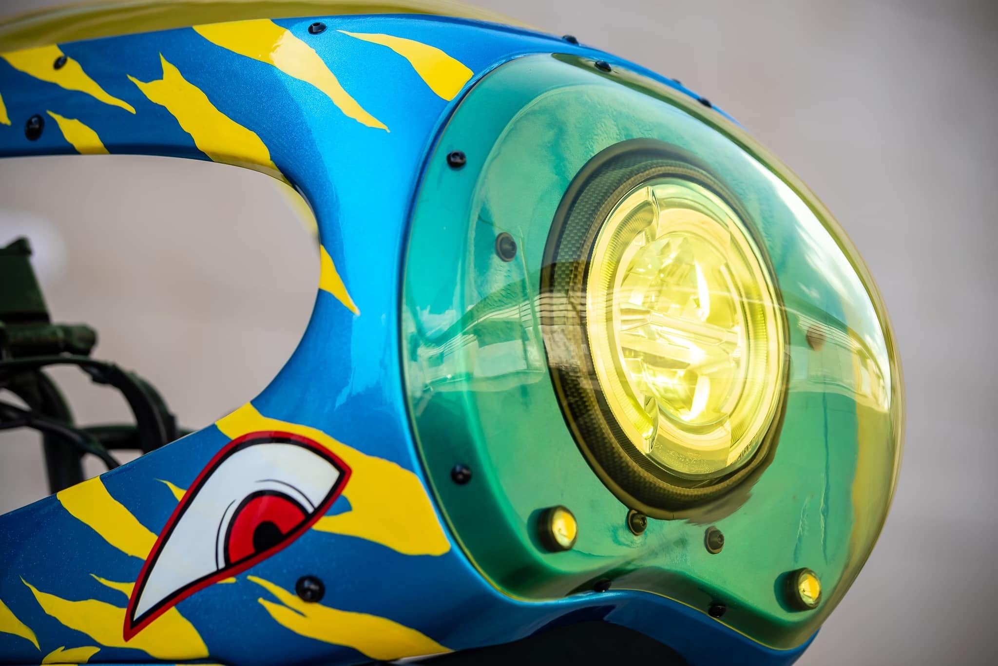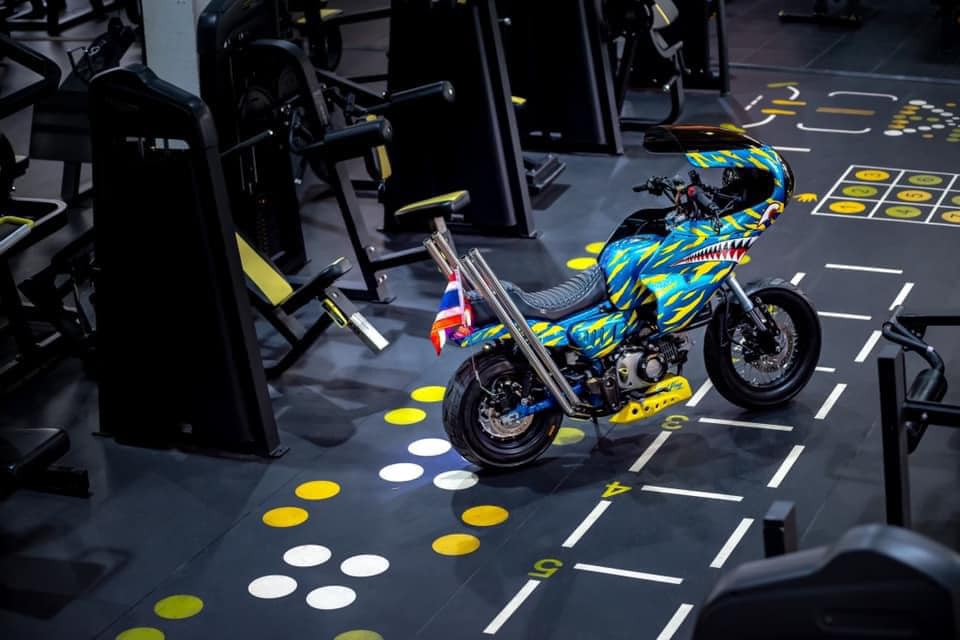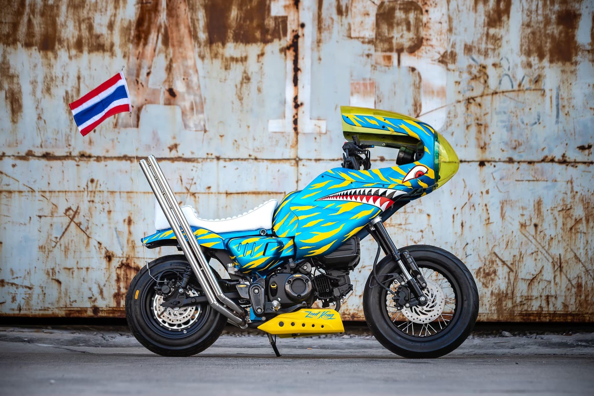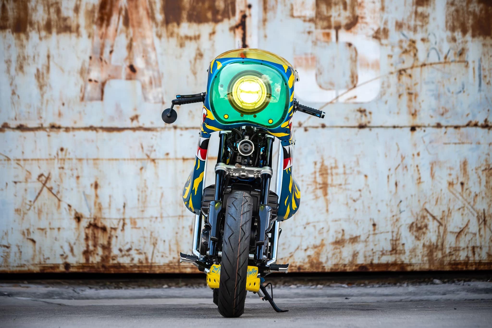 這台車的設計可謂極盡誇張,雙出排氣管發出震撼街頭的聲浪,彷彿是一場機車交響樂;座椅採用不協調的白色,像是在挑釁傳統審美觀;鮮黃色的風鏡與綠色大燈護罩,更是無視所有色彩搭配的規則,讓人一眼便無法忽視。此外,車體上的鯊魚牙齒塗裝更像是在大聲宣告:這絕不是一台平凡的Monkey 125。