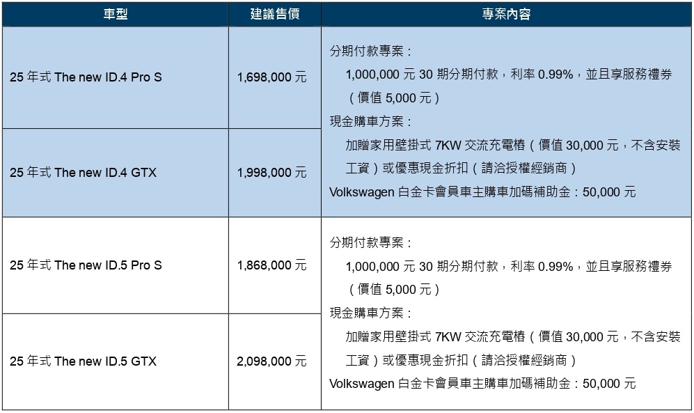 即日起至1月底,ID.車系推出多項限時購車優惠,現在入主不僅可享低利率100萬30期分期付款專案,還能獲得價值5,000元服務禮券,現金購車方案有機會獲得好禮家用壁掛式7KW交流充電樁(價值30,000元),Volkswagen白金卡會員車主換購車再享加碼補助金50,000元,歡迎消費者親臨全台授權展示中心,體驗ID.車系的非凡魅力,探索純電車的全新可能。