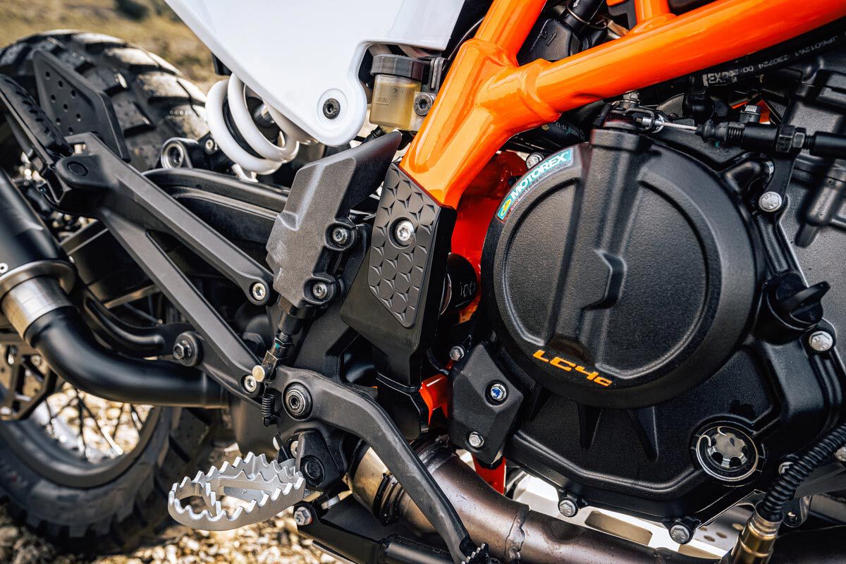 車架採用專為越野打造的雙鋼管框架,並配置可調高度的握把,與 690 Enduro R 類似,這款車採用了一體式座椅設計,車架經過重新調校以適應越野需求。21 吋與 18 吋的前後鋼絲輪框搭配 Metzeler Karoo 4 輪胎,讓這款車在泥濘與沙地上同樣表現出色。