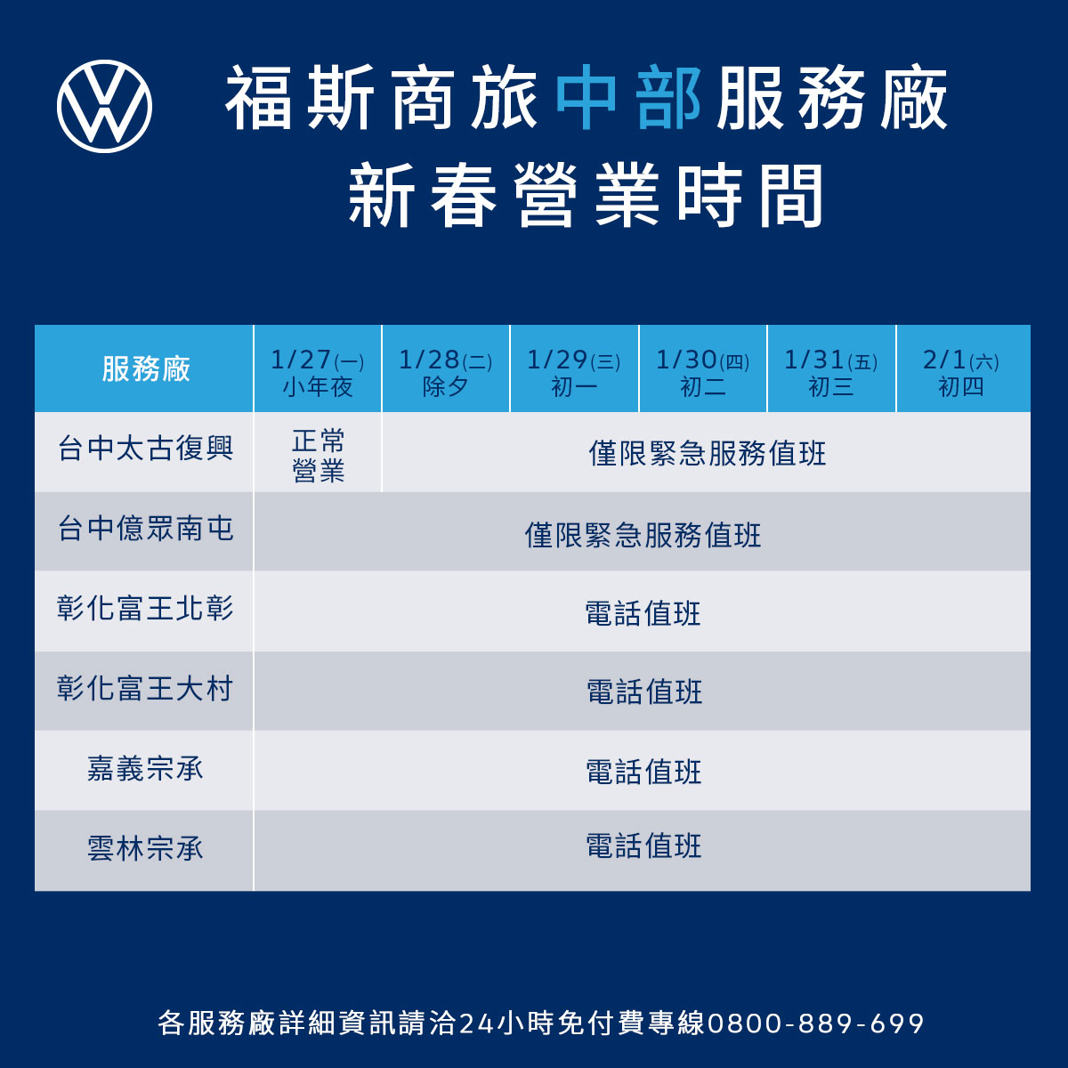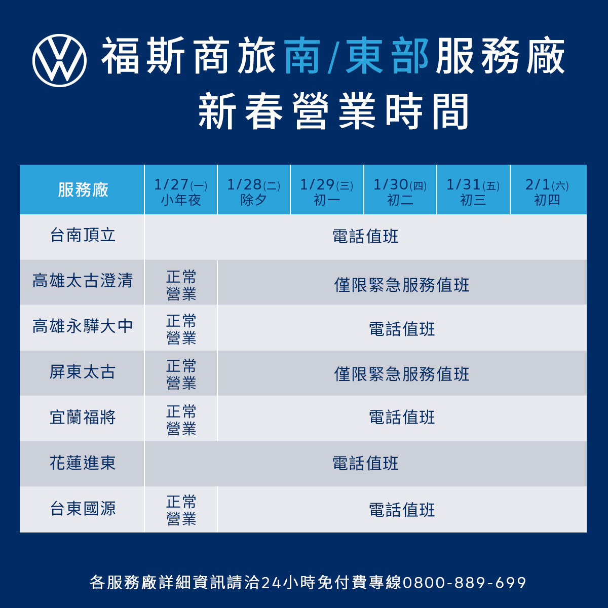 迎接農曆新年假期到來,台灣福斯商旅於今日宣佈全台展示中心暨服務據點之春節營運服務時間如下: