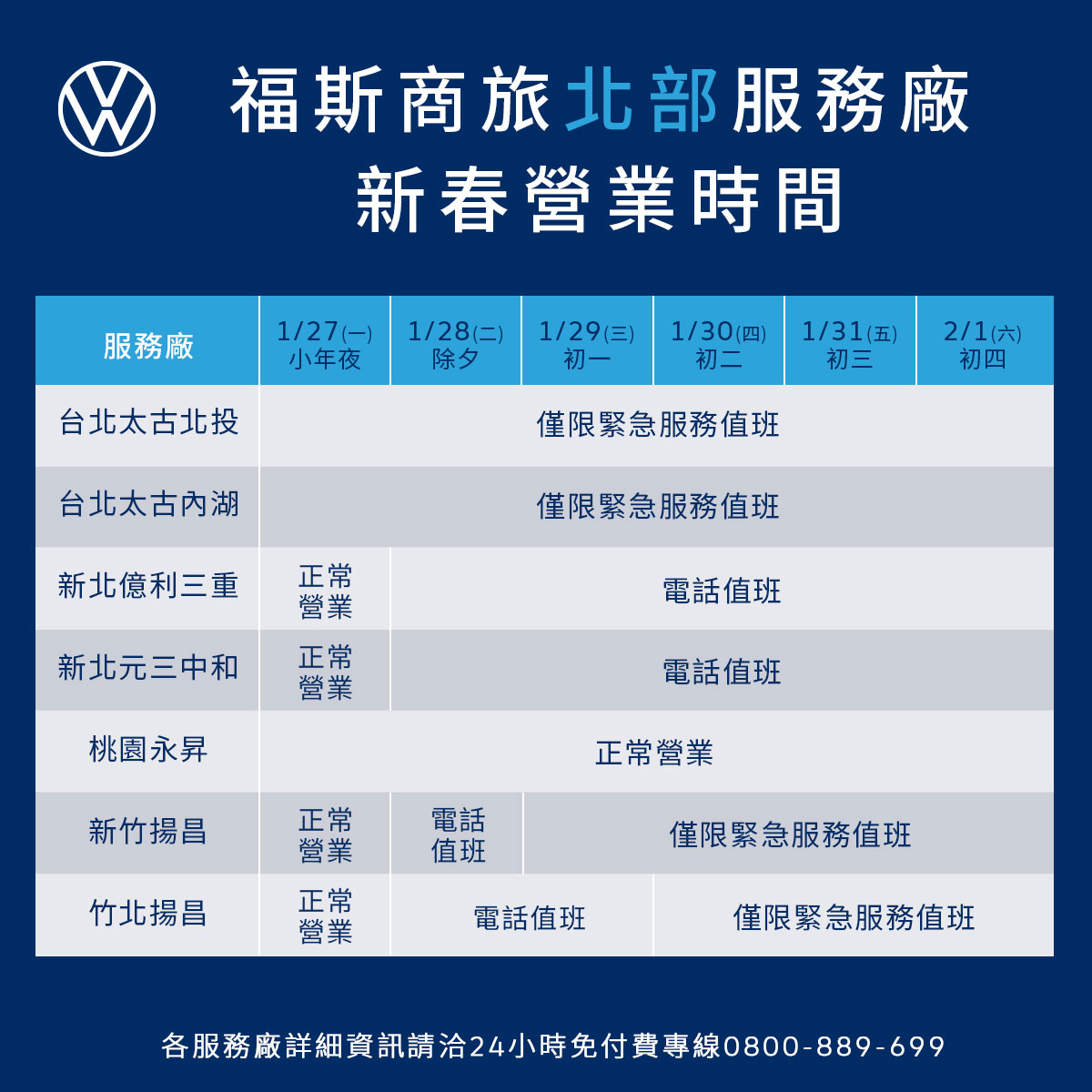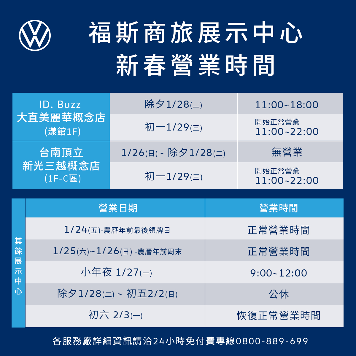 福斯商旅全台展示中心於小年夜(1月27日)之營業時間為9:00-12:00,除夕(1月28日)至大年初五(2月2日)農曆春節假期暫停營業,大年初六(2月3日)恢復正常營業。至於全台各地區服務廠自除夕(1月28日)當天起至大年初四(2月1日),也將安排值班人員駐點為車主提供緊急服務值班,各服務廠將同步於大年初六(2月3日)起恢復正常營業(詳情請見下表),讓所有車主都能在春節期間開心出遊平安返家,安心享受VanLife旅程。