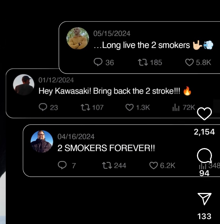 這支影片僅僅 10 秒鐘,主要呈現了一系列 Kawasaki 粉絲留言,要求回歸二行程時代。短片結尾的文字「我們聽到了」明確表明 Kawasaki 團隊正走向一場「煙霧繚繞」的技術革命。