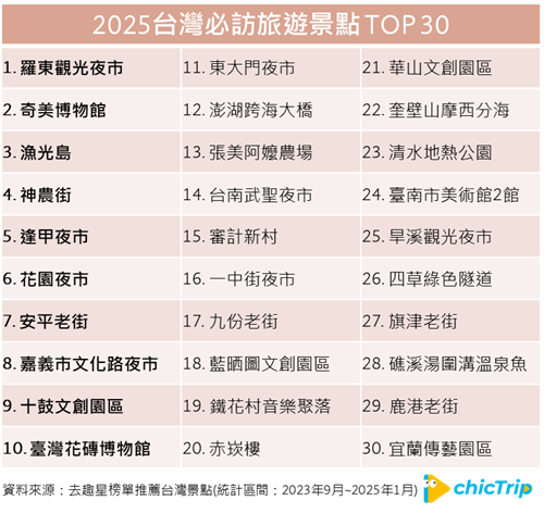 在台灣,羅東夜市、逢甲夜市等10大夜市榮登榜單,展現台灣夜市文化的多元與魅力,是小吃愛好者的天堂,更是體驗在地生活的最佳場所。第二多的類別是「文化與歷史景點」,包含九份老街、赤崁樓及宜蘭傳藝園區等,展現台灣獨特的歷史足跡與人文風貌,讓旅人沉浸於故事與時光中。第三多的景點為「自然景觀」類,包含澎湖跨海大橋、四草綠色隧道等7處,讓旅人探索海天一色與溫泉秘境,享受放鬆與療癒時光。最後不能錯過的是「文創景點」,如:奇美博物館、十鼓文創園區、藍晒圖文創園區等,以創新與藝術為主題,成為新一代必訪打卡地標。