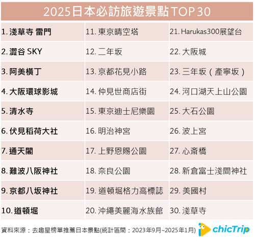 綜觀日本榜單,「文化與歷史景點」是榜單的一大亮點,如東京的淺草寺雷門、京都的清水寺及伏見稻荷大社,都以深厚的文化底蘊成為旅客心中的經典。「城市地標與購物熱點」也備受青睞,東京的澀谷SKY、大阪的道頓堀、與沖繩的美國村,融合了現代都市風格與購物體驗,吸引年輕族群蜂擁而至。東京迪士尼樂園、大阪環球影城,這些世界知名的主題樂園是家庭和情侶旅行的首選,結合娛樂與夢幻體驗,魅力無法抵擋。