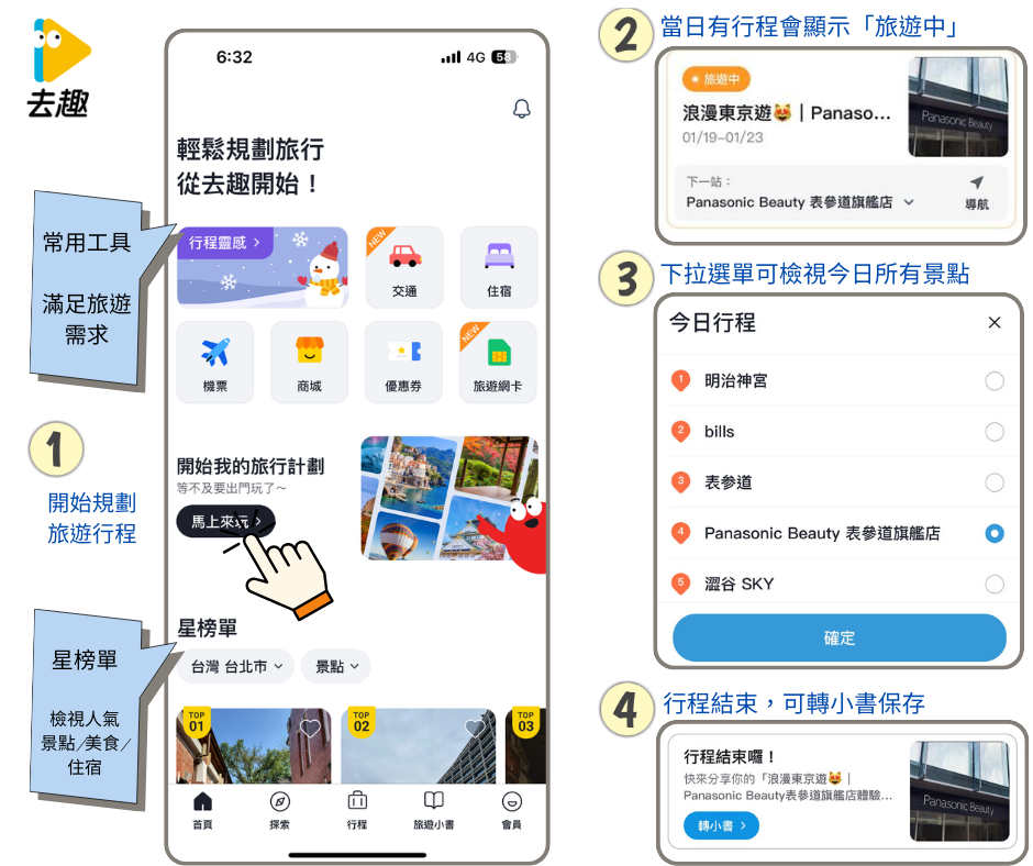 另外一個改版新亮點「首頁隨時查看旅遊行程」,按照旅遊日期,自動顯示當日旅行計畫,即時查看接下來的景點導航,輕鬆享受旅遊過程。在住宿景點還可連結訂房功能,會員更享高額和泰Points回饋!現在就打開去趣,規劃你的寒假旅遊計畫!