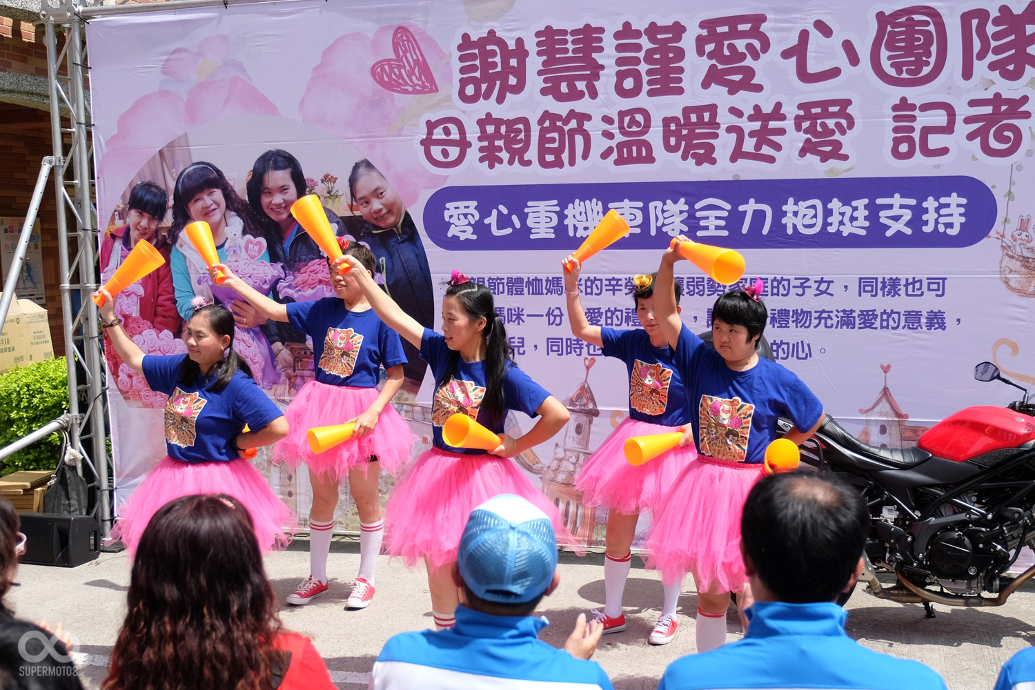 一大早愛心團隊和SUZUKI重機騎士便集合在真善美社會福利基金會,憨兒啦啦隊用舞蹈表演回饋大家的愛,愛心團隊幫憨兒們一起接力把花束放置到重機上,台鈴工業 資深經理林進賢表示:「特別感謝熱血的SUZUKI車友們,及在地的榮立、慶鑫、日德車業三家經銷商的主動協助,報名愛心騎士相當踴躍,同時車友們也提到能參與此次公益活動很榮幸。」