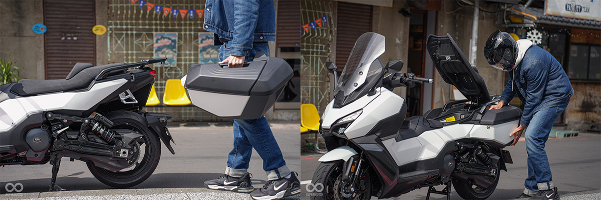 空間絕對是這次 TTLBT 想傳達的亮點,首先左右兩側的側箱是標準配備,它具有專屬快拆功能,可直接透過椅墊下方的釋放旋鈕進行安裝與拆下操作。側箱稍嫌可惜並無聯動 Keyless 開啟,側箱實體鑰匙整合在 Keyless 感應器中。側箱空間如圖所示,放個三天兩夜的行李綽綽有餘。坐墊下的空間則可放入一頂全罩安全帽。