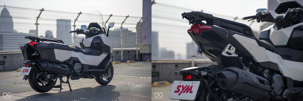 後方標配的快拆側箱與整合式後箱架,強調 TTLBT 在長途旅行中的實用性,滿足騎士對於大容量儲物空間的需求。車尾則採用俐落的 LED 燈組,同樣有幾分龜甲的視覺感受,結合流暢的輪廓設計,突顯 TTLBT 作為旗艦級巡航速克達的獨特個性。