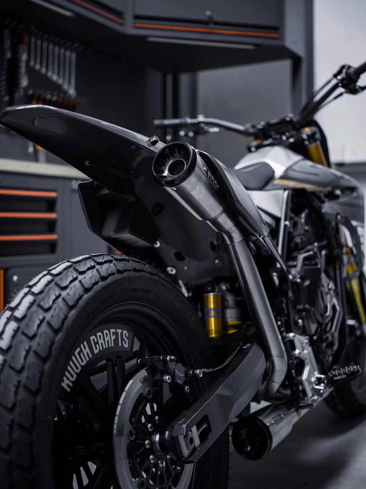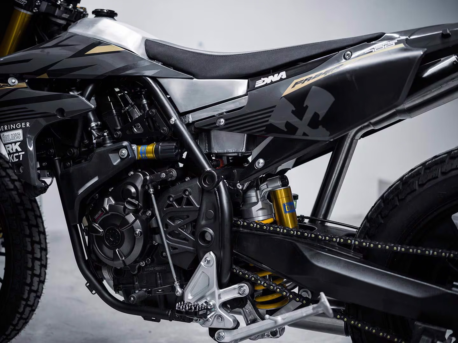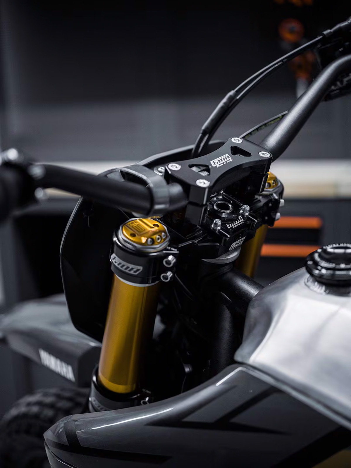 前懸吊採用 Öhlins RXF 48 S 前叉,特別為 Ténéré 700 進行 Flat Track 賽道化調校,搭配 FAOR 超級摩托車三角台,確保剛性與操控極致優化。而後懸吊則使用 Öhlins YA 818,配上 Rough Crafts 訂製的連桿,讓整體騎姿與比例更貼近 Flat Tracker 標準。