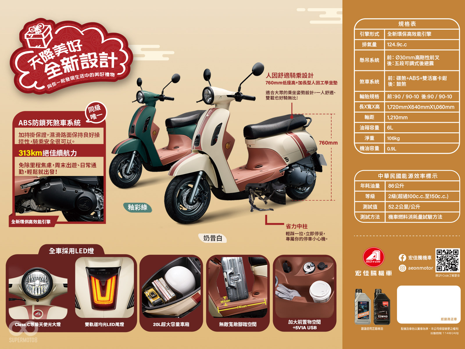 全新車色「奶昔白」與「釉彩綠」靈感來自「禮物」概念,車身線條如緞帶包裝,象徵每一台Dory 125 ABS都是祝福與守護的化身。建議售價僅為72,800元,是入門ABS車款中最超值首選。入主指定優惠再享限定贈禮與媽祖淨車加持,將守護與安全帶回家。