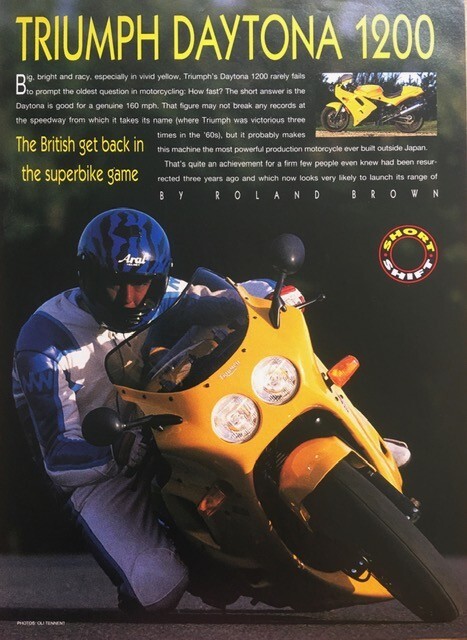 說到 Daytona,就不能不提那台經典的 1993 Triumph Daytona 1200。當年這台搭載 1180c.c. 四缸引擎的跑車,擁有 147hp 馬力與 115Nm 的扭力,最高時速可達 256km/h,結合高張力鋼管車架、Nissin 煞車系統與氣壓式避震器,當時可說是英倫性能代表作之一。