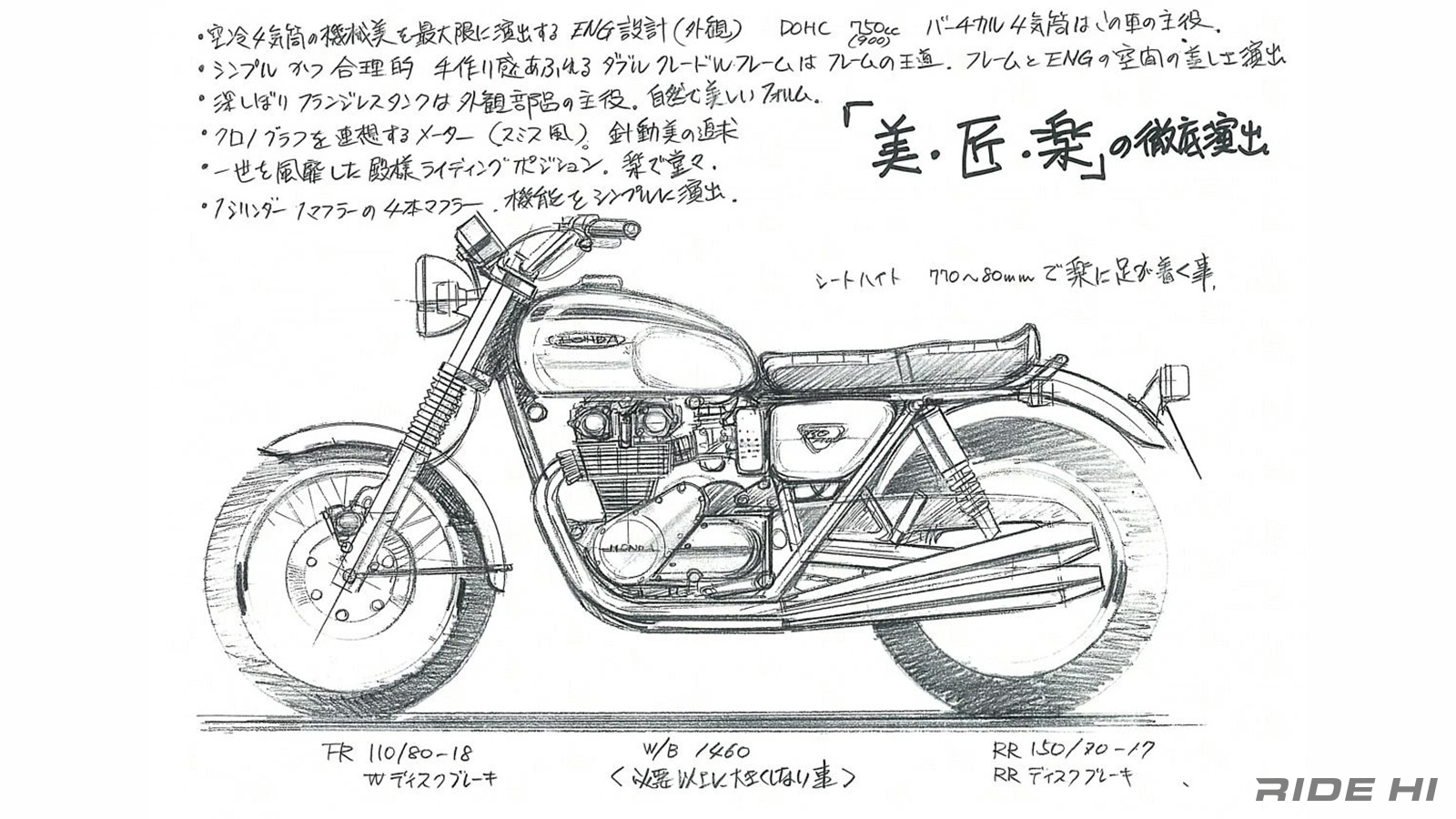 車頭部分,圓形大燈與鏡面鍍鉻飾件相映成趣,不僅散發出強烈的復古氣息,也兼顧了現代感,座椅的設計則採用分離式雙座結構,與稍微上翹的車尾線條相結合,營造出濃厚的運動風格。整體車身比例修長且優雅,車身各處細節無不散發出Honda對經典車型的致敬與現代詮釋。