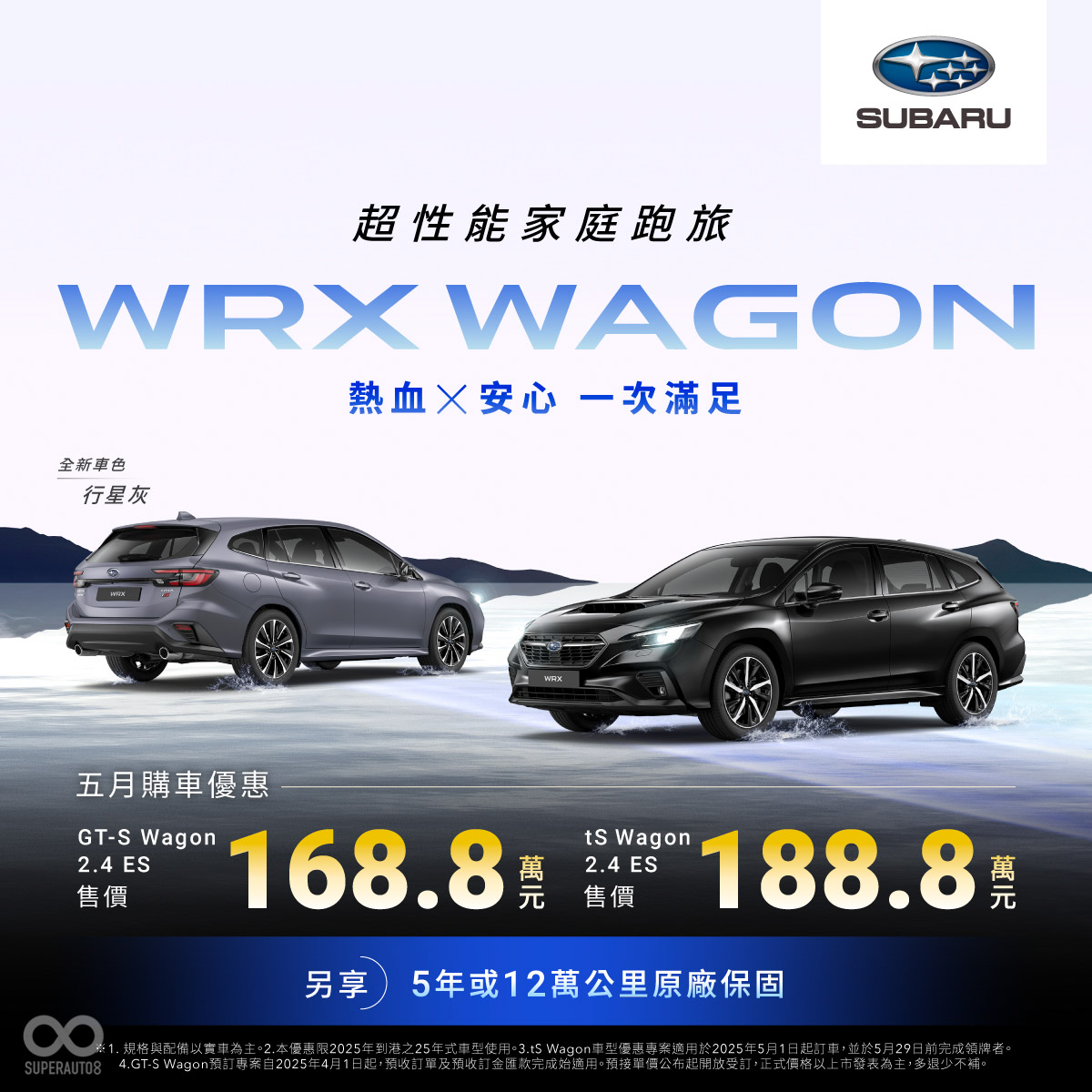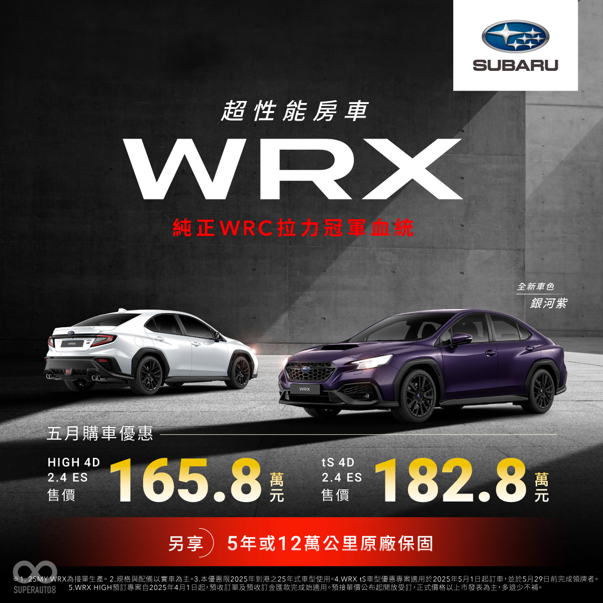 SUBARU台灣總代理意美汽車五、六月間活動不間斷,25MY WRX與WRX Wagon宣布正式上市,並開始陸續進駐各展示據點。同時也擴大舉辦五月試駕祭活動,快閃限定優惠加碼,並提供重磅老車主專屬回饋,邀您盡享SUBARU魅力好車。而最讓SUBARU車主與粉絲們引頸期盼的「2025 SUBARU 賽道家庭日」活動,更同步預告將於5月21日上午9時開始接受網站報名。