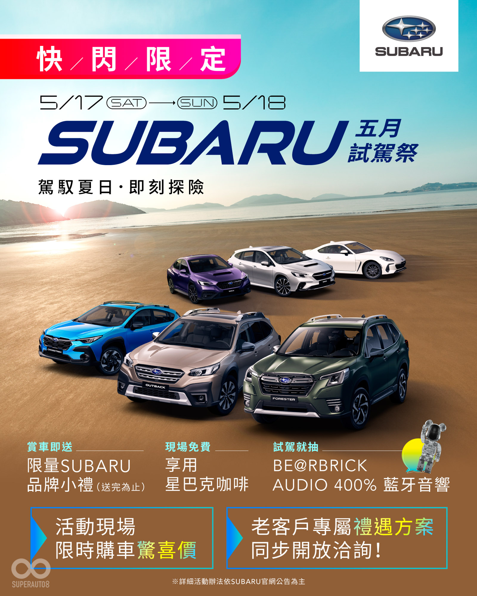 SUBARU五月試駕祭快閃限定,展間限時優惠加碼,並提供重磅老車主專屬回饋,邀您盡享SUBARU魅力好車