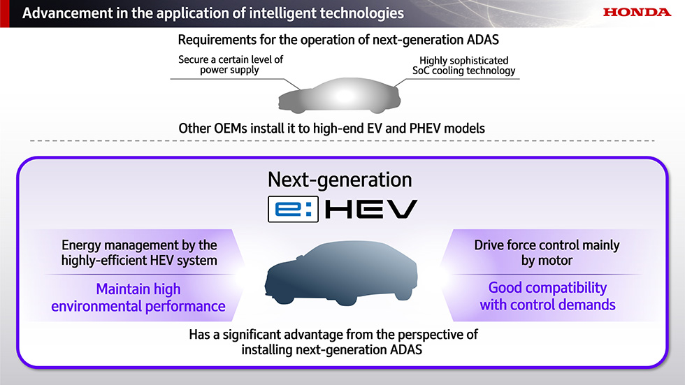 Honda 將善用其在油電技術與車輛設計方面的獨特優勢,並不僅限於在電動車(EV)上導入次世代 ADAS,也將應用於油電車(HEV)車型。透過這項策略,Honda 將發揮其龐大的事業規模優勢,實現高度競爭力與成本效率兼具,並以更親民的價格,為更多顧客提供兼具高附加價值與駕馭樂趣的「移動喜悅」。