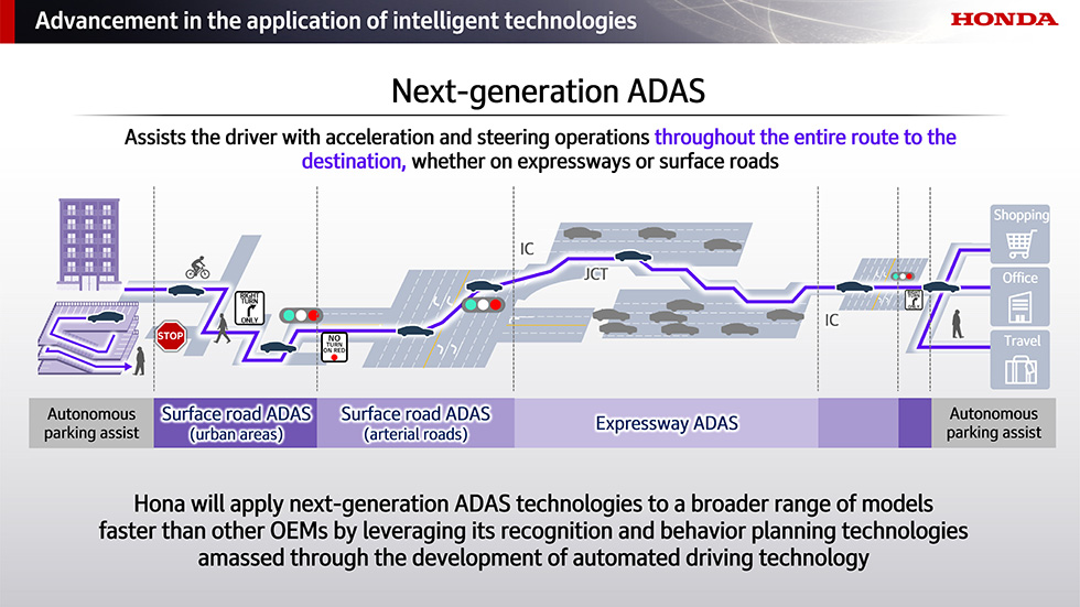 作為強化智慧科技應用的關鍵技術之一,Honda 正在開發自家原創的次世代先進駕駛輔助系統(ADAS)。該系統可協助駕駛者進行加速與轉向操作,從高速公路到市區道路,涵蓋整條路線,直至導航系統所設定的目的地。在複雜的都市環境中,因各類用路人共用道路且路口轉彎頻繁,開發次世代 ADAS 尤具挑戰性。然而,Honda 將活用多年來於自動駕駛開發中累積的影像辨識與行為判斷技術,全力研發能夠在包含都市道路情境下,也能實現安全、舒適駕駛體驗的次世代 ADAS。Honda 計畫自 2027 年起,於北美與日本市場推出的多款重點 EV 與 HEV 車型中,搭載這套全新次世代 ADAS 系統。