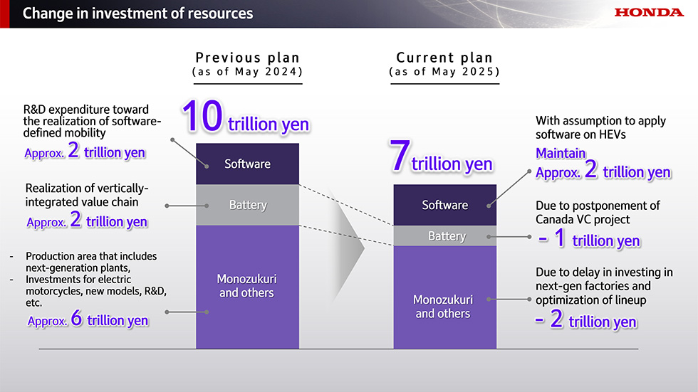 在先前宣布的至2031年投資10兆日圓推動電動化計畫中,Honda 根據決定延後加拿大 EV 價值鏈建設與專屬EV工廠的設立時程,將總投資額調整為7兆日圓(較原計劃減少3兆日圓)。