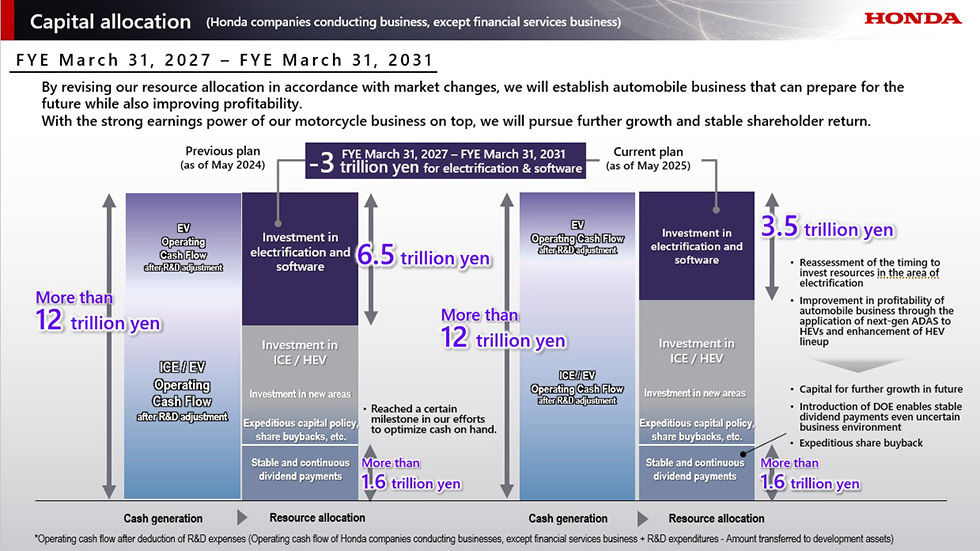自 2027 年會計年度起的五年期間內,Honda 預計將透過機車事業的穩定獲利能力與 HEV 銷量增加,創造超過12 兆日圓的現金流。在資源配置方面,EV 相關投資將減少3兆日圓,HEV相關投資則僅會小幅增加,股東回饋仍維持原先目標,總額達 1.6 兆日圓以上。