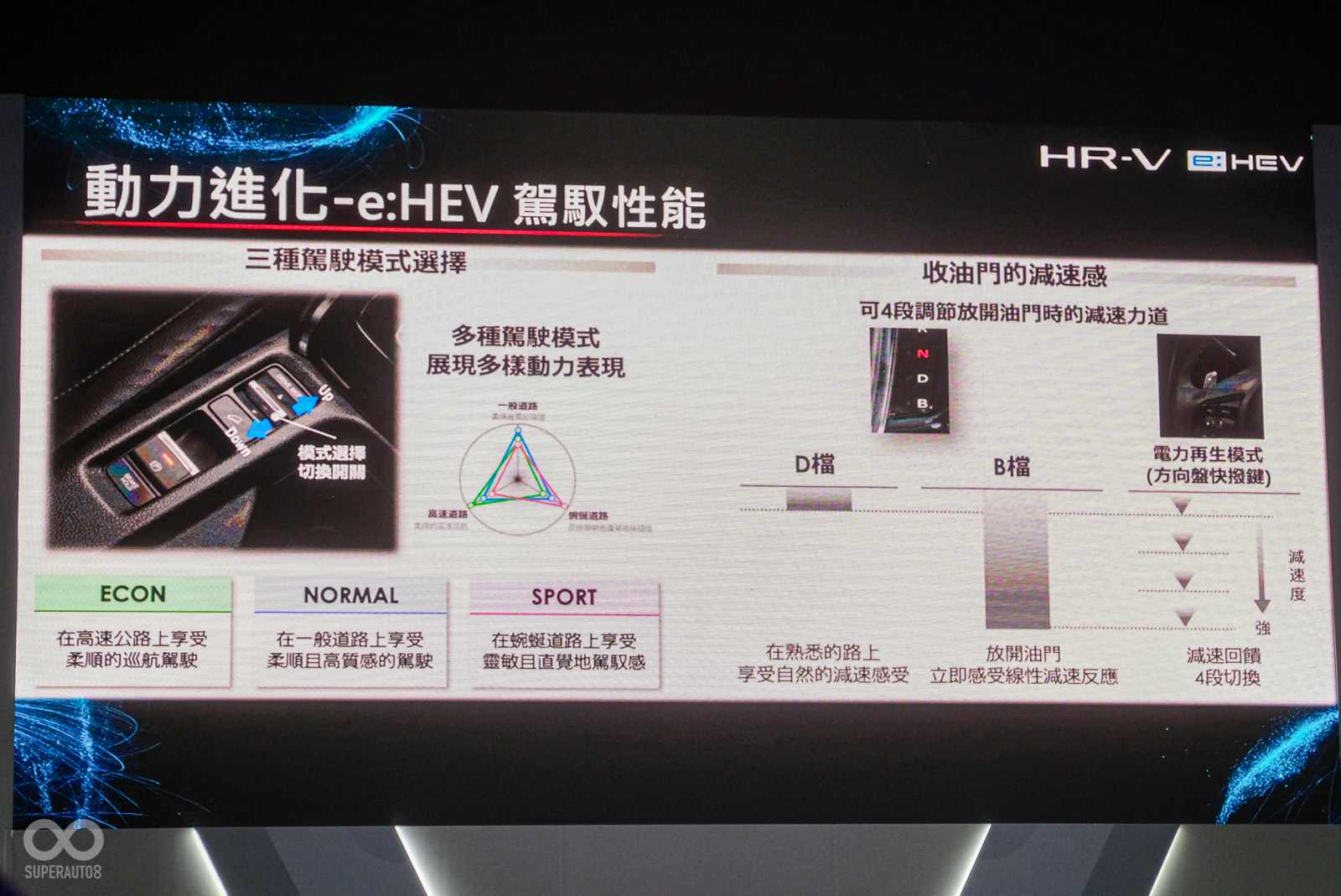 為提供駕駛更個性化的行車體驗,All-new HR-V e:HEV 搭載三種駕駛模式:ECON、NORMAL、SPORT。在高速道路上,ECON 模式提供柔順的巡航感受;NORMAL 模式則適合一般道路,帶來高品質且易於操作的駕駛體驗;SPORT 模式則展現強勁反應與直接操控,滿足對操駕樂趣的渴望。此外,HR-V e:HEV 車型具備可對應不同的四段式電力再生模式方向盤快撥鍵,不僅在 D 檔與 B 檔之間提供不同的減速強度,依照駕駛偏好選擇減速力道,無論是在市區代駕還是山道通勤,都能兼顧順暢與操控性。HR-V e:HEV 在駕駛感受上全面進化,讓每一段旅程都充滿駕馭與節奏感。