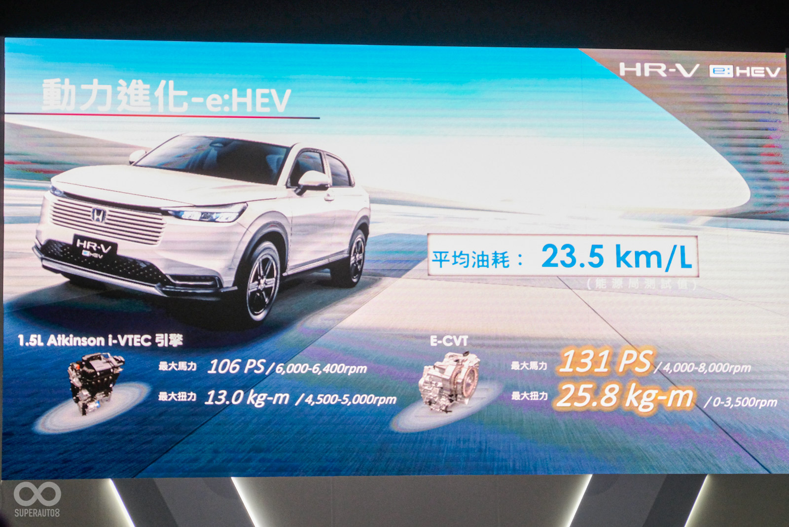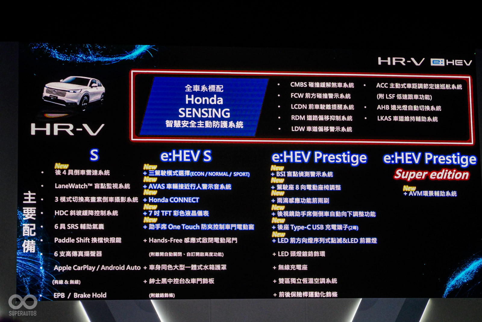 All-new HR-V 首度結合 e:HEV 電驅雙動能與 1.5L 引擎新配置,塑造國產同級 No.1 的 25.8 kg-m 大扭力輸出優勢與 23.5km/L 平均油耗,實現前所未有的駕駛樂趣與絕佳燃油效率。All-new HR-V S、e:HEV S、e:HEV Prestige,預接單價格分別為 79.9 萬元、90.9 萬元、96.9 萬元。更新增搭載 AVM 環景輔助系統的 e\:HEV Prestige SUPER EDITION,預接單價 98.9 萬元,並預計於 6 月 21 日上市。欲知更多相關資訊,敬請消費者至全台 Honda Cars 經銷據點,或關注 Honda Taiwan 官方網站訊息。