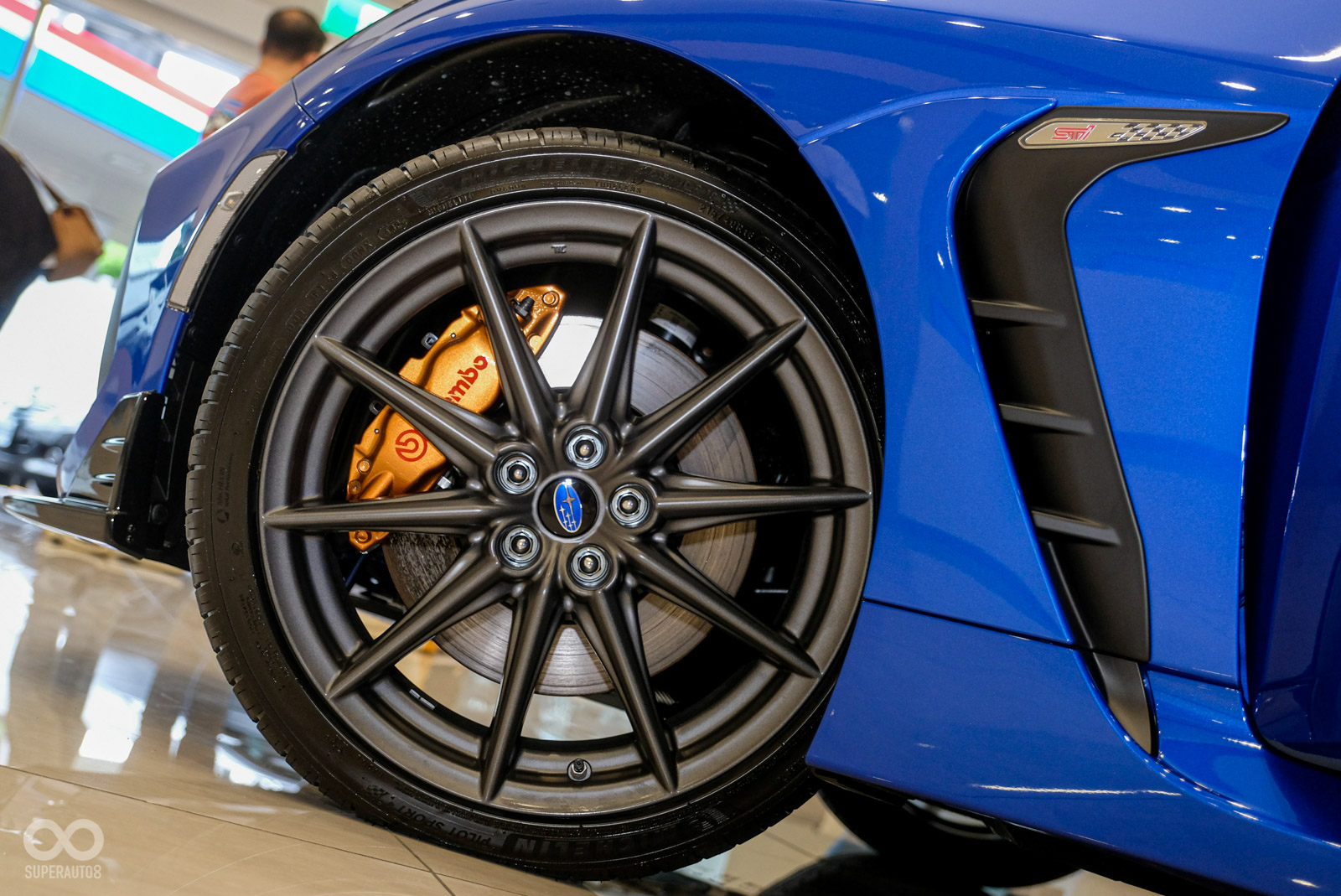 BRZ STI Brembo極速性能限量版所搭載的Brembo煞車系統,可以明顯看到其金色外觀搭配紅色Brembo字體的招牌卡鉗設計,為其在視覺上帶來明顯的升級感受,而前輪卡鉗本身也從原本標準車型的雙活塞升級為對向4活塞的配置,後輪則也從單活塞升級至對向雙活塞的版本。