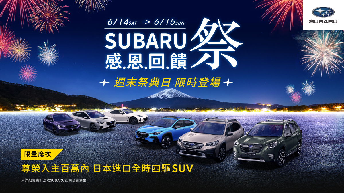 感恩回饋祭的活動高潮也將於6月14日(六)至6月15日(日)限時登場,Subaru祭典期間精選旗下熱銷車款集結展示,現場也準備有豐富日系點心,賞車試乘的精美禮品與小朋友最喜愛的扭蛋抽獎等活動。6月入主SUBARU全車系,即享夏季專屬限時優惠,百萬內即可尊榮入主原裝進口、全時四驅的日本SUV車款,為您的旅程增添安心與駕馭樂趣。