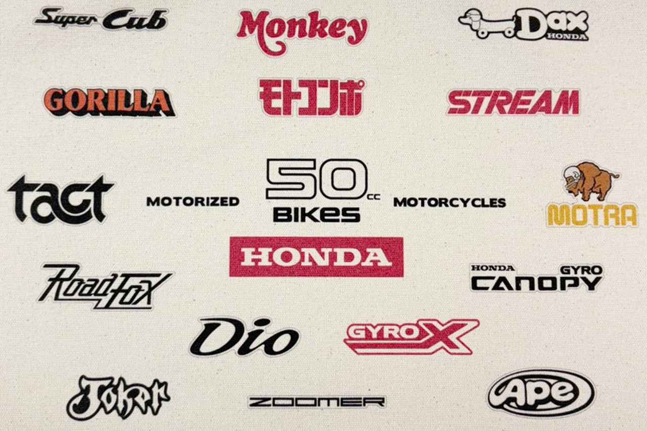 這一系列以象徵昭和至平成年代街頭風景的經典車款為主題,包括 Super Cub 50、Monkey、Gorilla、Dax 以及 CD50 等 Honda 旗下最具代表性的 50c.c. 原付車型,其車款 LOGO 以印刷風格排列於帆布與布料上,讓人一眼穿越回那段人車合一、青春熱血的年代。