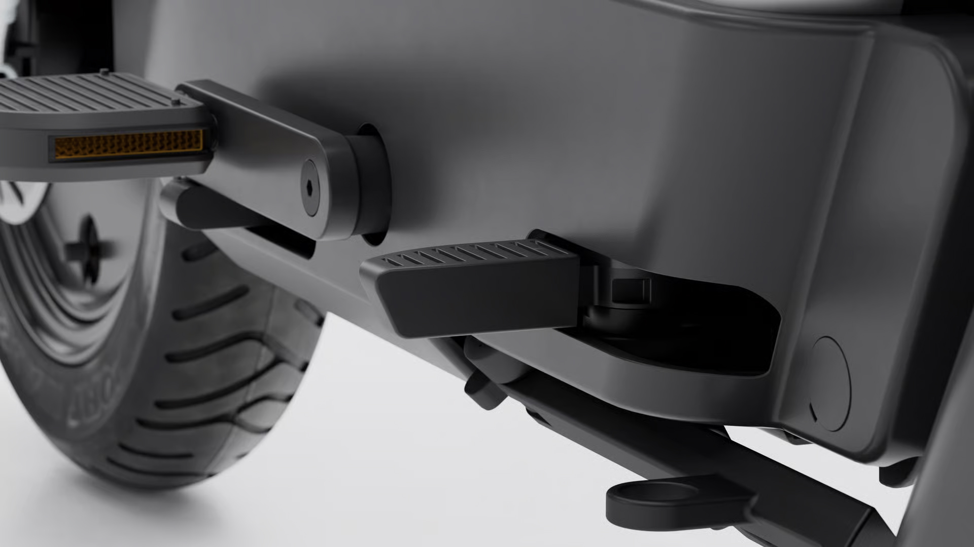 Olto 採用俐落銳角的鋁合金外殼,搭配鋼材與鋁鑄底盤,車身線條強烈、風格獨特。一體成型的長坐墊設計可容納兩名乘客,後座乘客專屬摺疊腳踏,前座則能用磁吸式腳踏當作腳靠,切換電門純電騎乘也很順手。