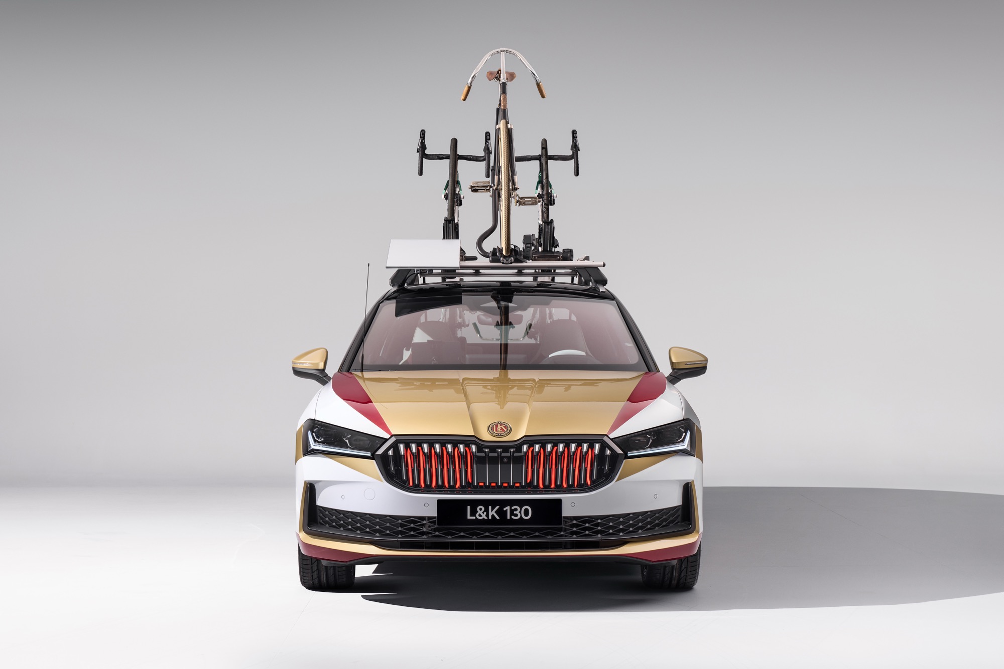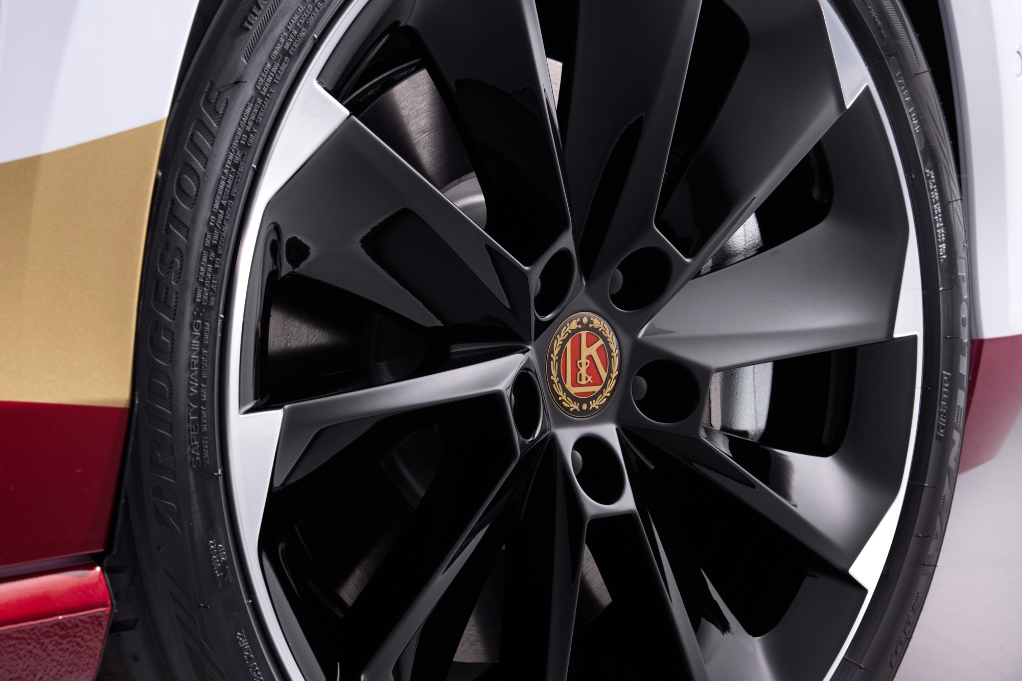 視覺效果上,這台特製的皮卡配備19吋Supernova輪圈,並採用金、紅、黑與白交錯的醒目彩貼塗裝。Laurin & Klement的品牌標誌點綴於多處細節,並搭配發光水箱護罩與黑色烤漆外觀元素,整體風格既現代又不失個性。