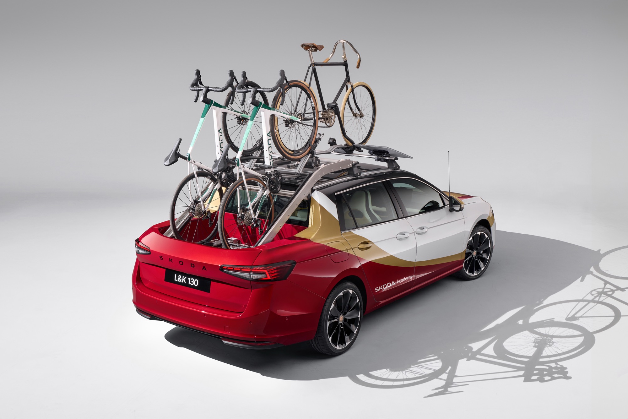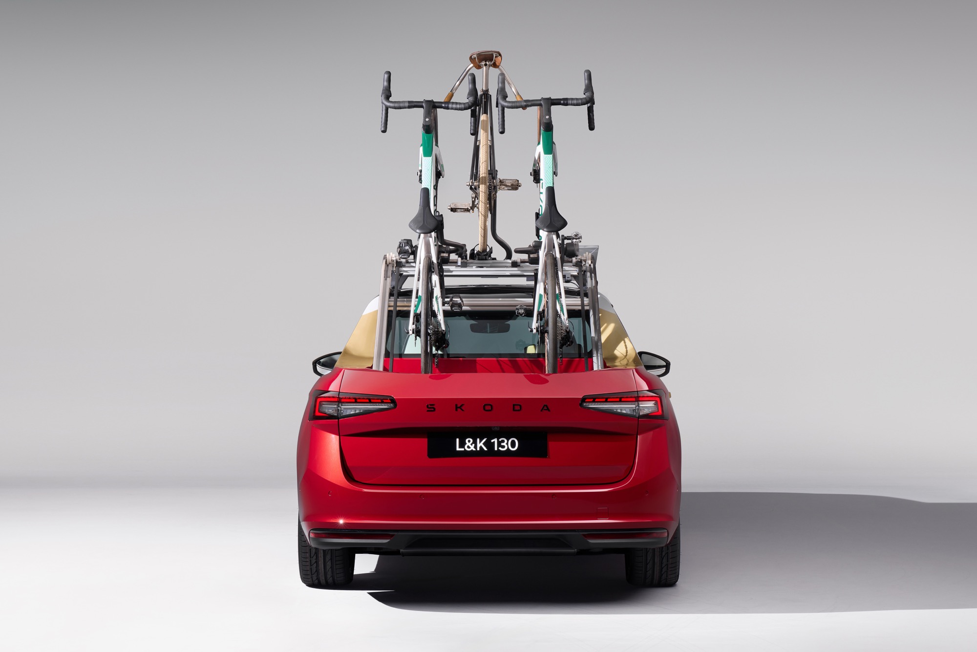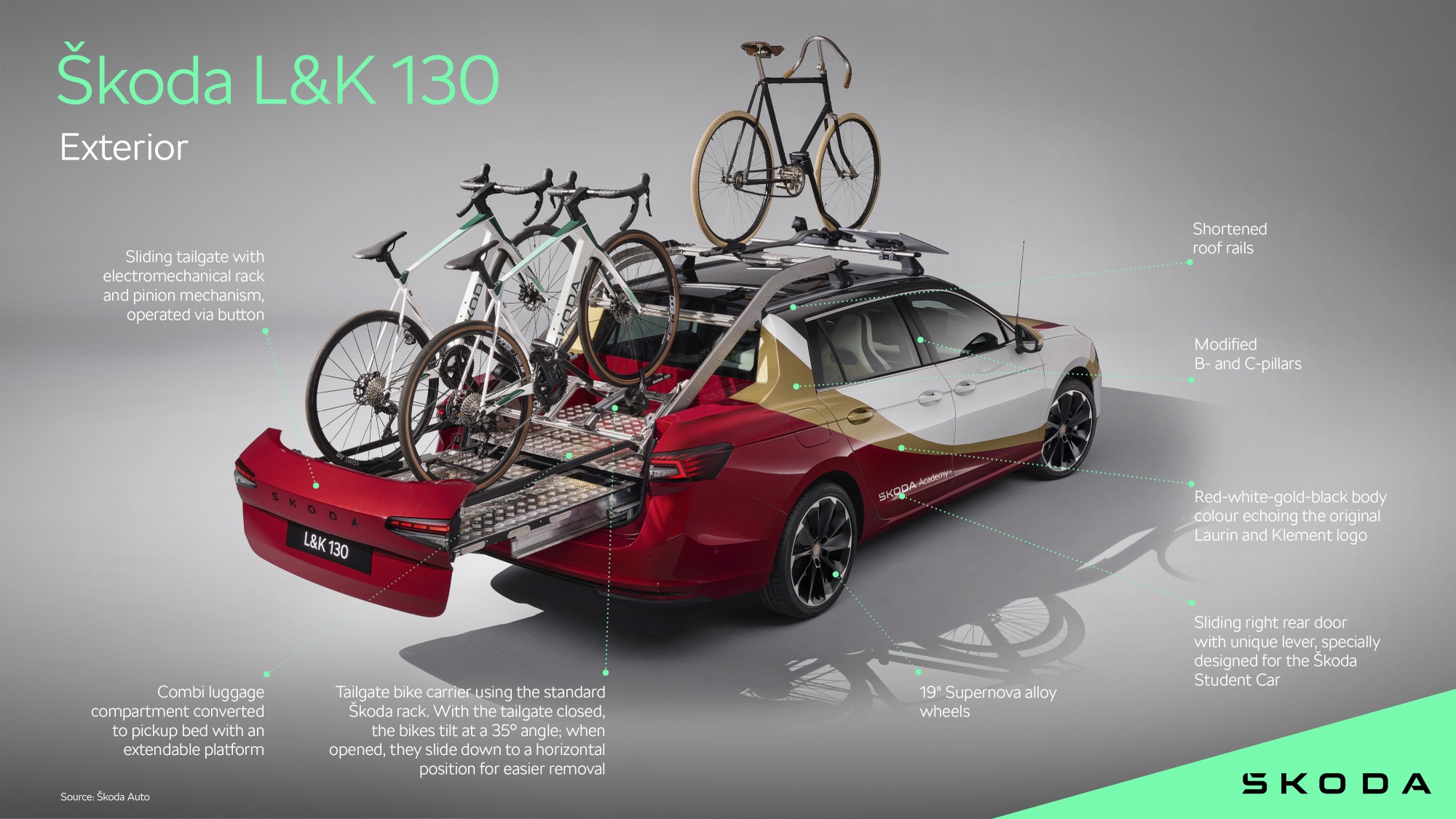外觀方面,L&K 130保留了Superb Combi的車頭輪廓,但在車尾進行了徹底的改裝。尾廂空間轉變為小巧實用的開放式貨床,搭載電動滑動尾門設計,讓存取貨物變得更簡便迅速,兩輛賽車專用腳踏車固定於滑軌上,若有需要,車頂架還可再承載一輛。為實現這項設計,團隊切除了後半車頂結構,並加入專屬的後窗與B柱強化結構,車身右側也配備了獨特滑動式後門,擁有雙把手設計,進一步提升了使用彈性與實用性。