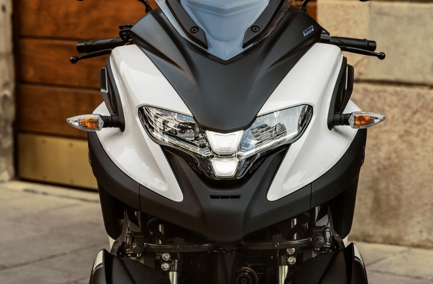 白色金屬這款新車色,表面細緻的金屬光澤,讓整車散發出一種清新而又高雅的質感。車身線條經過精心設計,光線的變化讓車體在不同角度下顯得更加立體,強調出Tricity 300本就具有的精緻與高級氛圍。