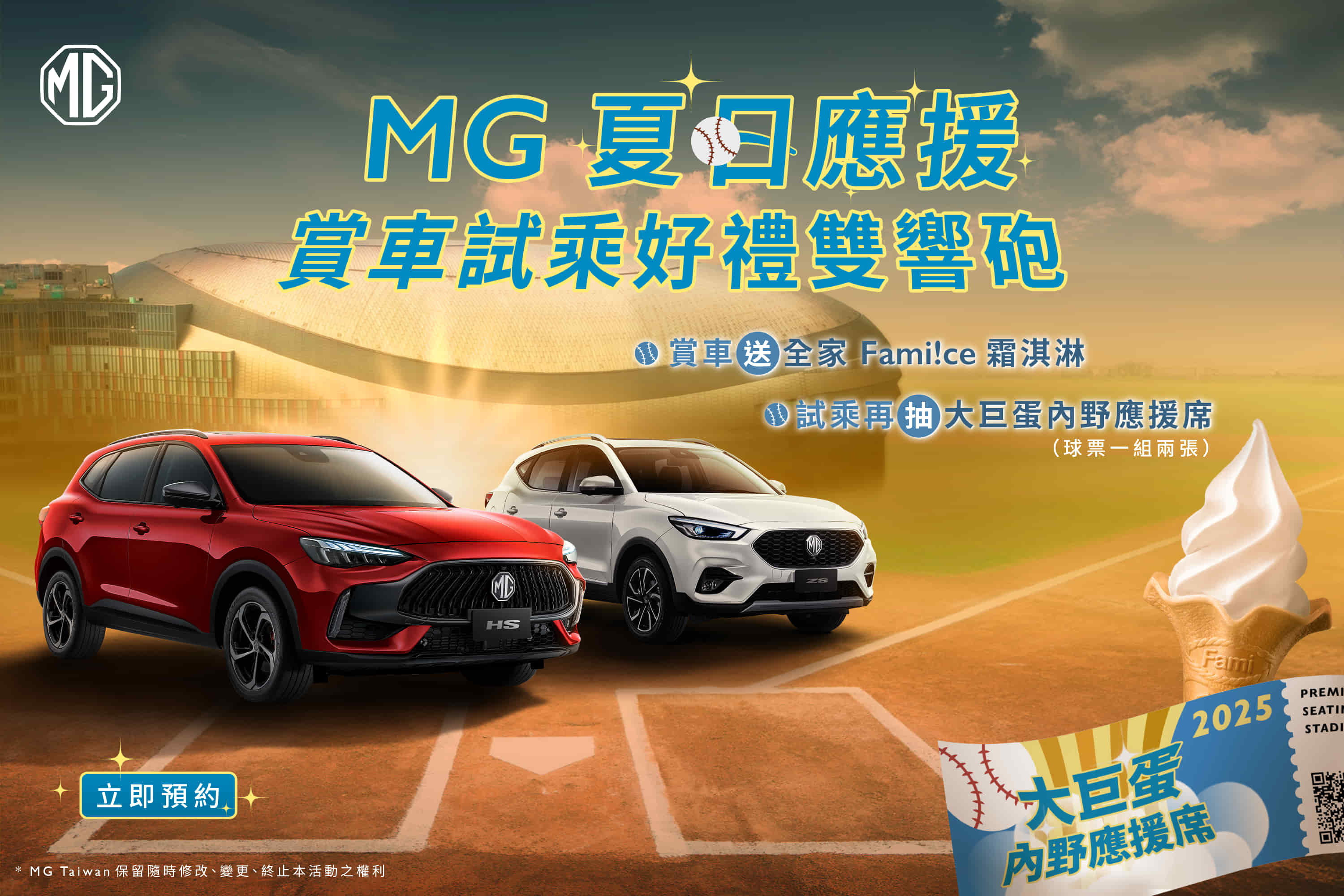七月盛夏,陽光燦爛,正是出遊的好時節!誠摯邀請對駕馭品質與生活風格有要求的消費者,親臨MG全台展示中心,親身感受HS與ZS車系所展現的設計質感與駕馭魅力。於本月完成試駕體驗,除了能深入感受MG車款的優異性能,還可獲得消暑沁涼的霜淇淋作為試乘好禮,為賞車體驗增添一份甜蜜!更棒的是,還有機會抽中臺北大巨蛋棒球賽門票,親臨現場感受台灣頂級棒球賽事的熱血沸騰!選擇一部真正符合生活需求的 MG 車款,搭配七月史上最強檔的購車優惠,開啟一段從容、有感的夏日駕馭旅程!