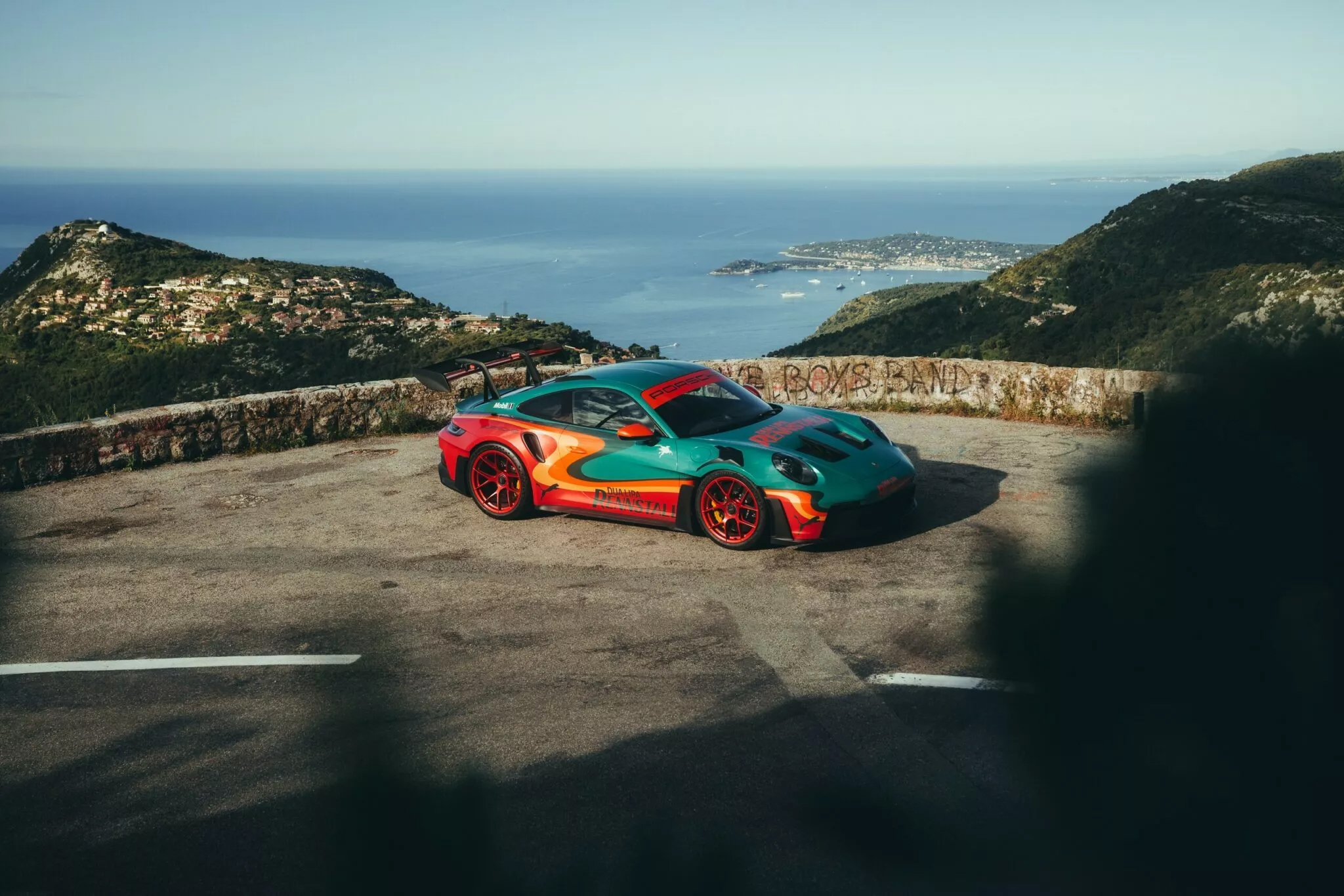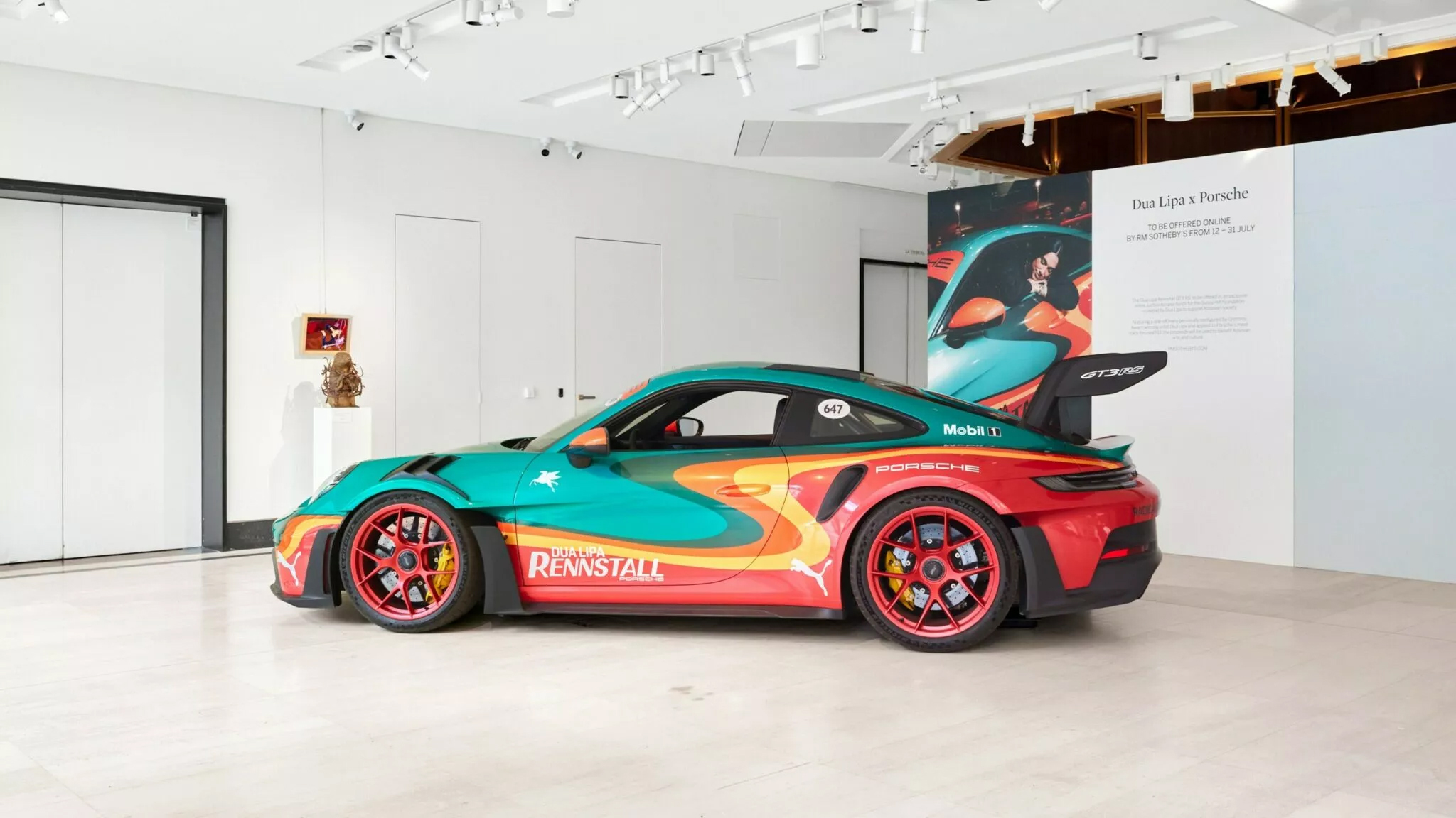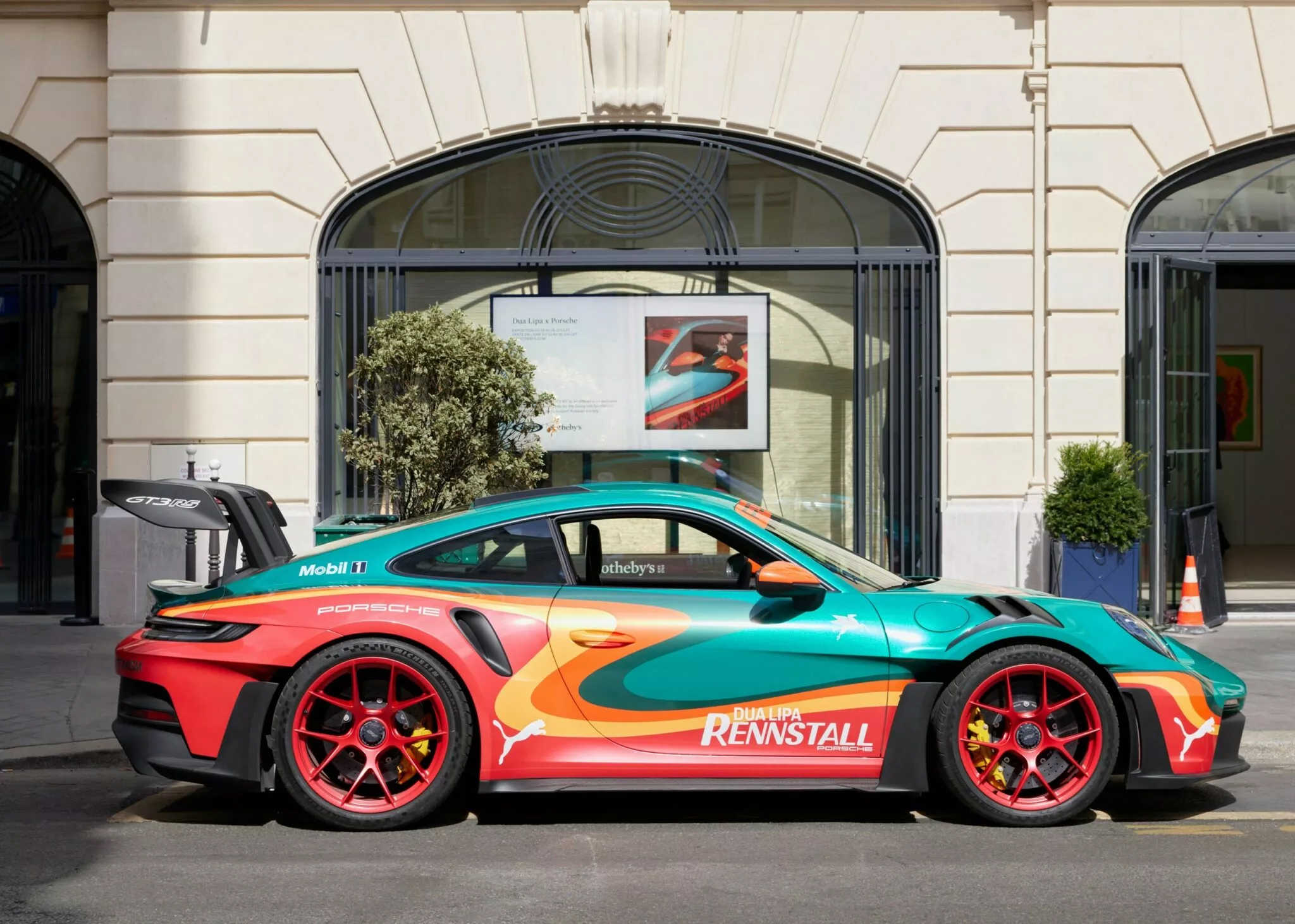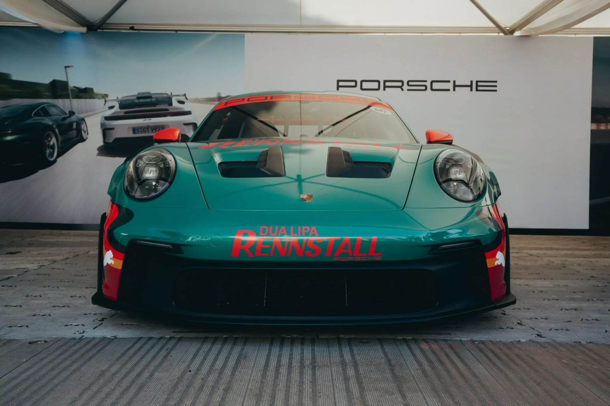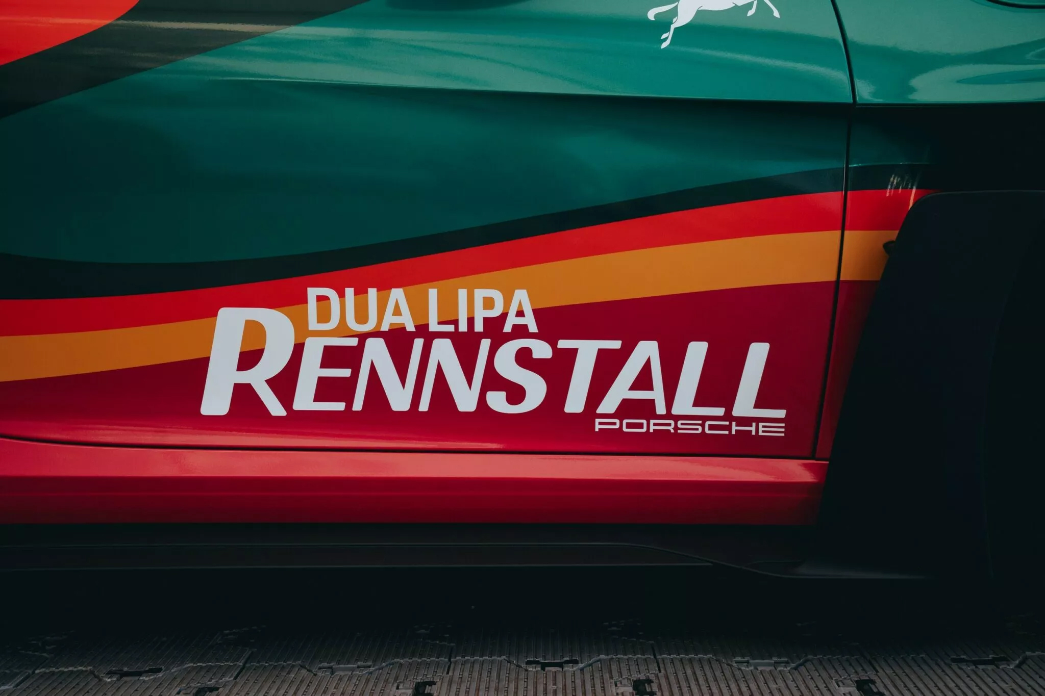這輛 GT3 RS 原出廠色為 Arctic Grey(極地灰),在 Dua Lipa 的親自參與設計下,披上了前衛又不失復古感的塗裝:亮眼的松石綠、紅、金、深綠相間的彩繪塗裝,風格讓人聯想到 Porsche 賽車歷史中那些經典的賽道戰袍。車身與引擎蓋上也可見「Dua Lipa Rennstall」字樣,突顯其獨特身份。