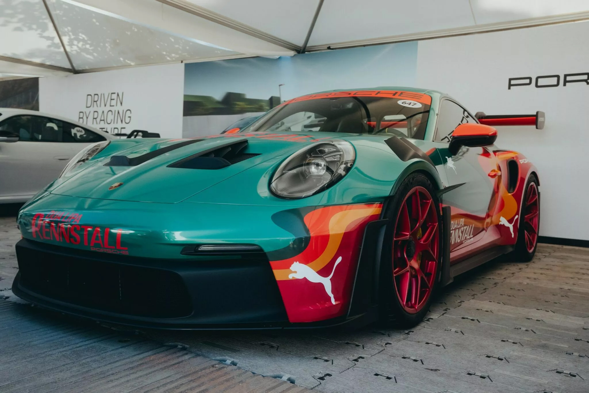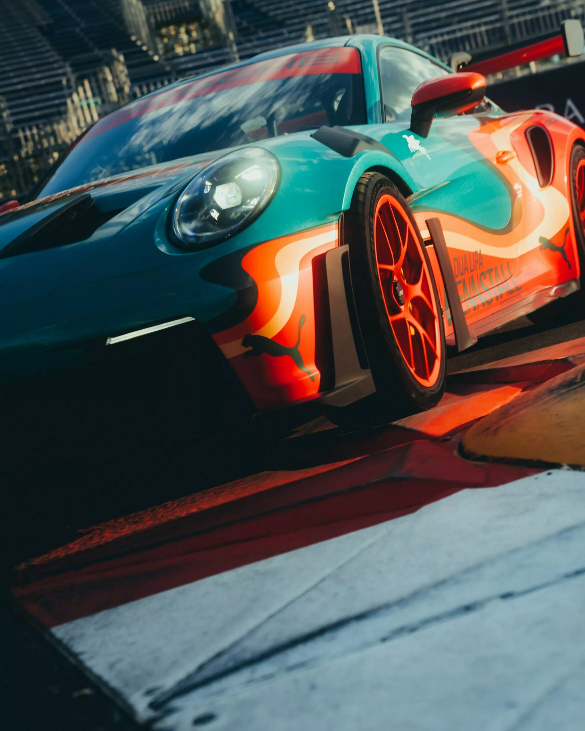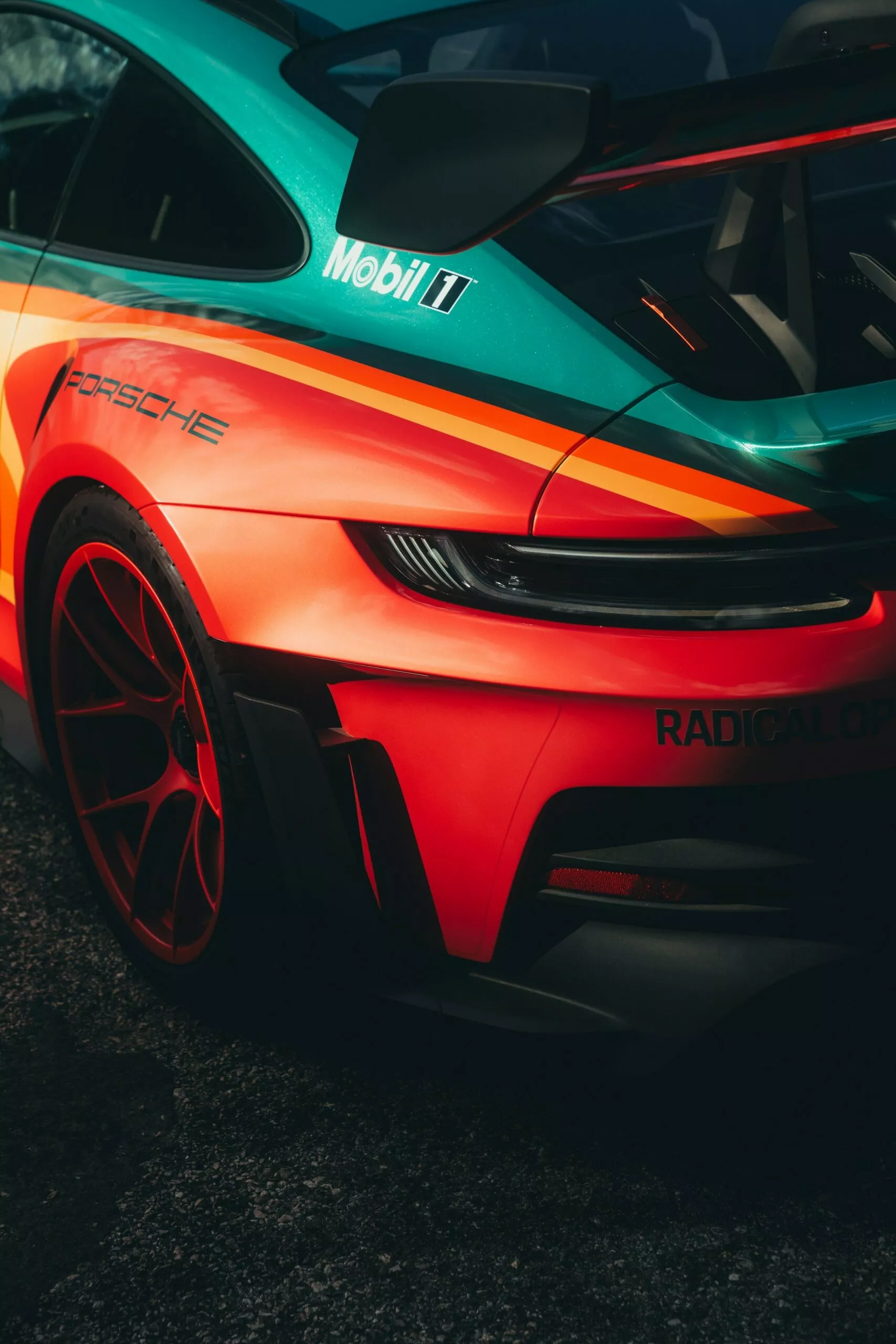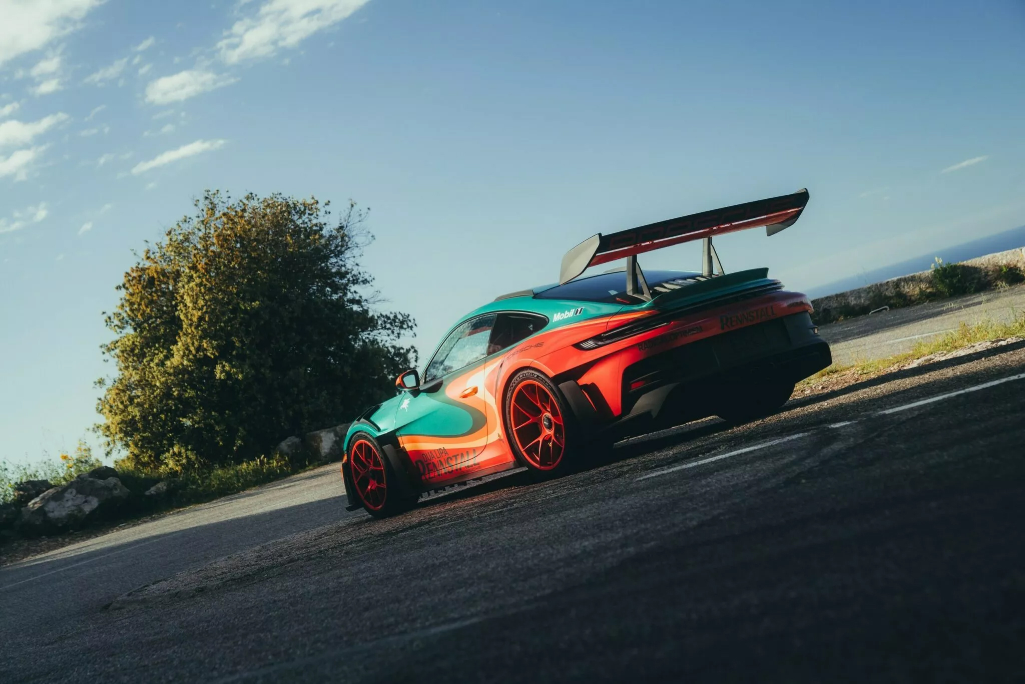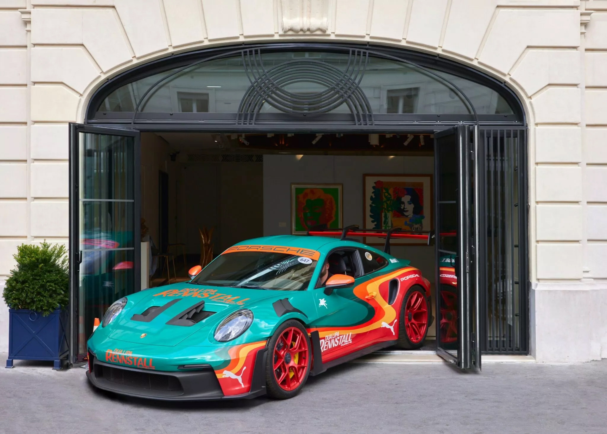 這輛 GT3 RS 原出廠色為 Arctic Grey(極地灰),在 Dua Lipa 的親自參與設計下,披上了前衛又不失復古感的塗裝:亮眼的松石綠、紅、金、深綠相間的彩繪塗裝,風格讓人聯想到 Porsche 賽車歷史中那些經典的賽道戰袍。車身與引擎蓋上也可見「Dua Lipa Rennstall」字樣,突顯其獨特身份。