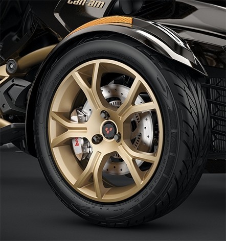 在這次的十周年紀念當中,推出了三款Can-Am Spyder的特仕車,RT、F3以及F3-S的車型都擁有10周年限量版車型,也是為了這次紀念這項新的里程碑所做出的特別車型,外觀上可以馬上辨認出十周年紀念版的不同,黑色的烤漆擁有強烈的金屬感,搭配上金色的輪圈、車架,營造出一股非凡的氛圍,而從車頭看去各車型也都有一小塊金色得鈑件,讓人不論從哪個角度都可以馬上辨認出這輛車的特別。