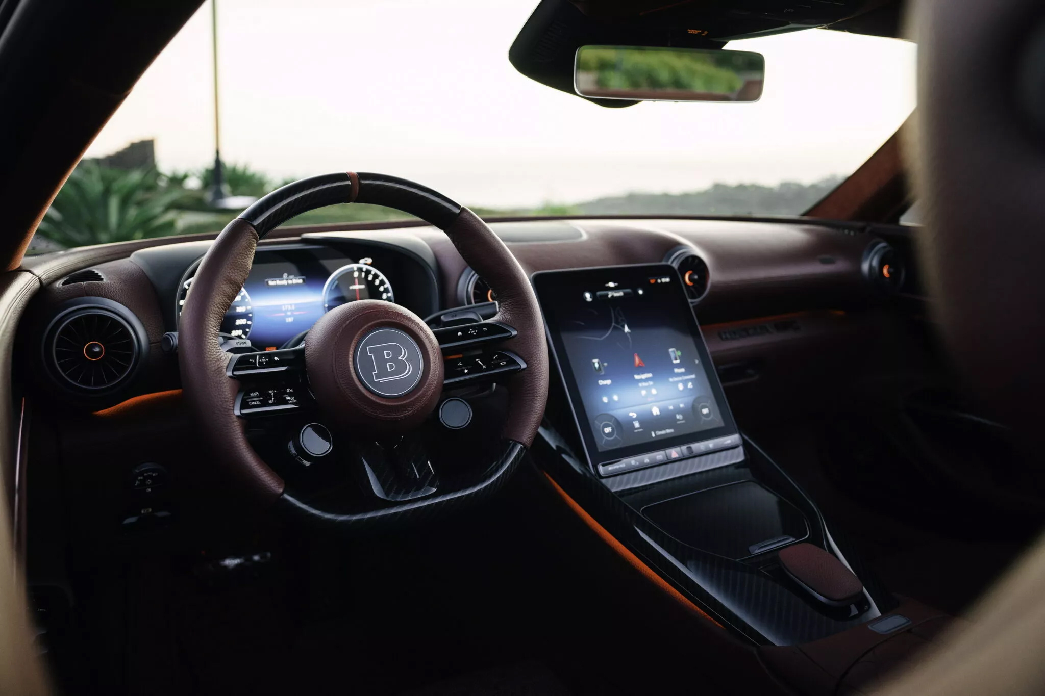 進入座艙後,更是強烈視覺衝擊。Brabus 將幾乎所有表面覆蓋上紅色皮革,其餘細節則以碳纖維與金屬材質點綴,營造極具戲劇張力的座艙氛圍,徹底呼應「DEEP RED」的命名主題。
