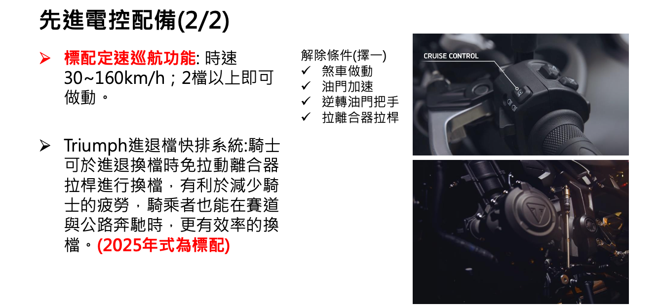 搭配標配的彎道 ABS、三模式騎乘電控(Rain / Road / Sport)、可切換循跡控制、定速巡航,以及全 LED 照明與 TFT/LCD 混合儀表,Trident 660 在中量級街車市場早已是熱門選擇;相較之下,Trident 800 未來如果正式發表,不僅在動力上直接進入百匹俱樂部,車格也更接近 Street Triple 765,還有望針對煞車、懸吊和電控等系統進行升級。